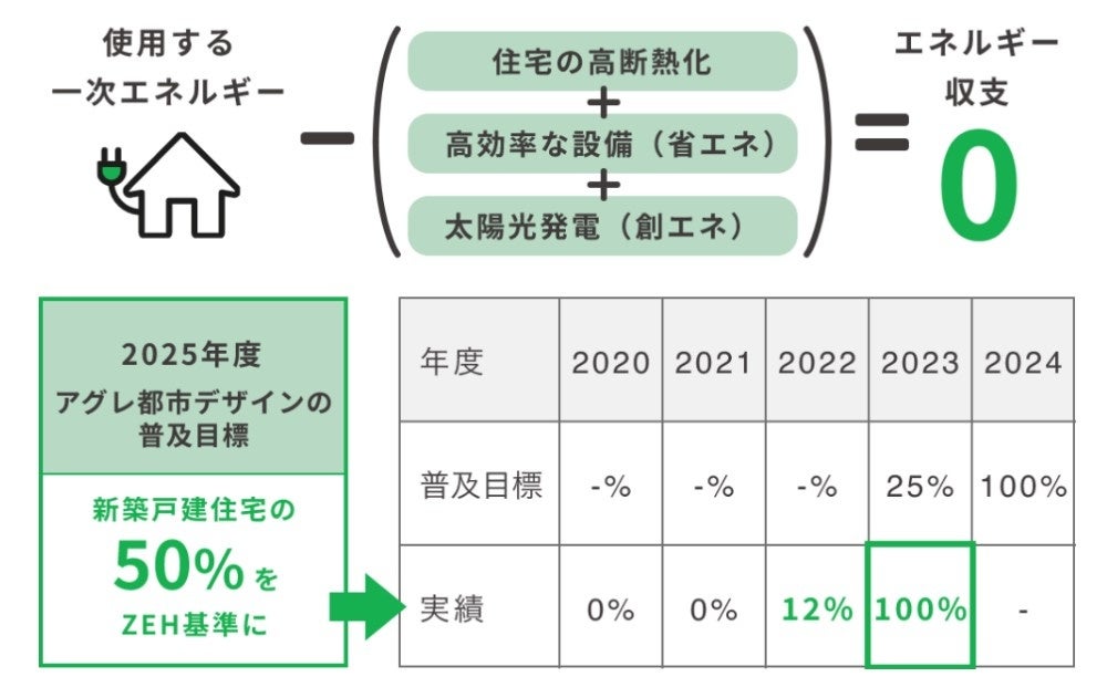 また、政府が掲げた「2030年度以降新築される住宅について、ZEH基準または省エネルギー性能の確保を目指す」「2030年において新築戸建住宅の6割に太陽光発電設備が設置されることを目指す」という目標に向け、当社はZEHの普及に取り組み、2025年度の目標50%を2期前倒しの2023年度に達成しております。
