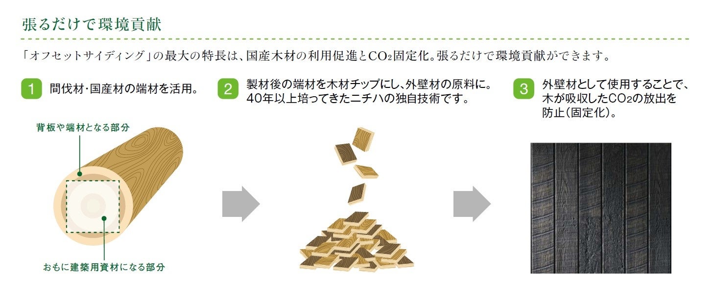 「オフセットサイディング」は、国産木材の端材で作ったチップを原材料として使用している外壁材で、日本の森林資源を守り、地球温暖化防止に貢献する「HWP=Harvested Wood Products(伐採木材製品)」にあたります。木材の有効利用に加え、木が成長過程で吸収したCO2を固定化する効果が認められています。ニチハの「オフセットサイディング」は張るだけで日本の森林資源を守り、地球温暖化防止にも貢献することができる外壁材です。