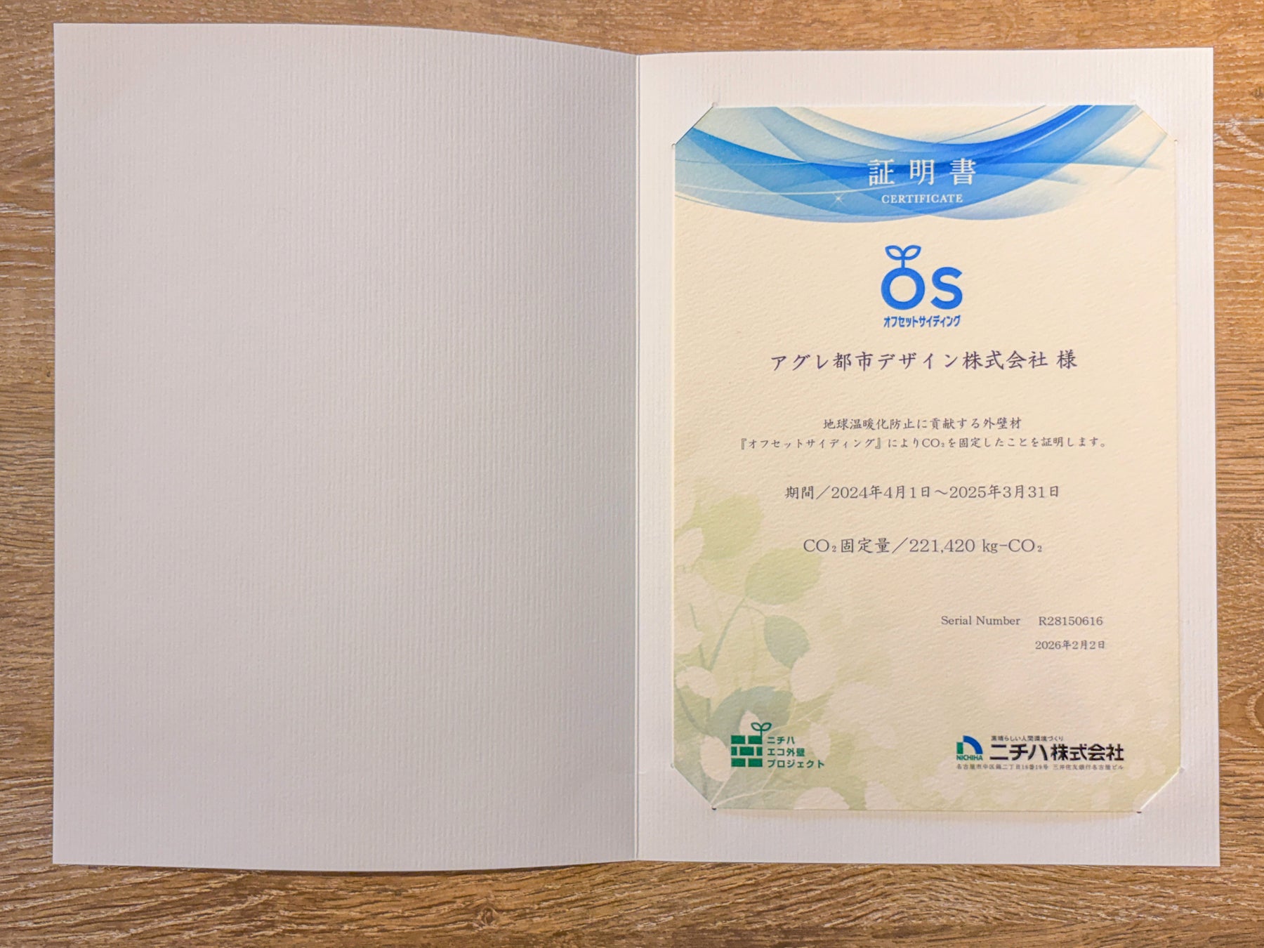 アグレ都市デザイン株式会社(本社:東京都新宿区、代表取締役:大林竜一、以下「当社」)は、ニチハ株式会社(本社:愛知県名古屋市、代表取締役社長:吉岡成充)が提供する、地球温暖化防止に貢献する外壁材「オフセットサイディング」採用により、二酸化炭素(CO2)固定量が221,420kgとなり、前年実績を上回る数値を達成したことをお知らせいたします。