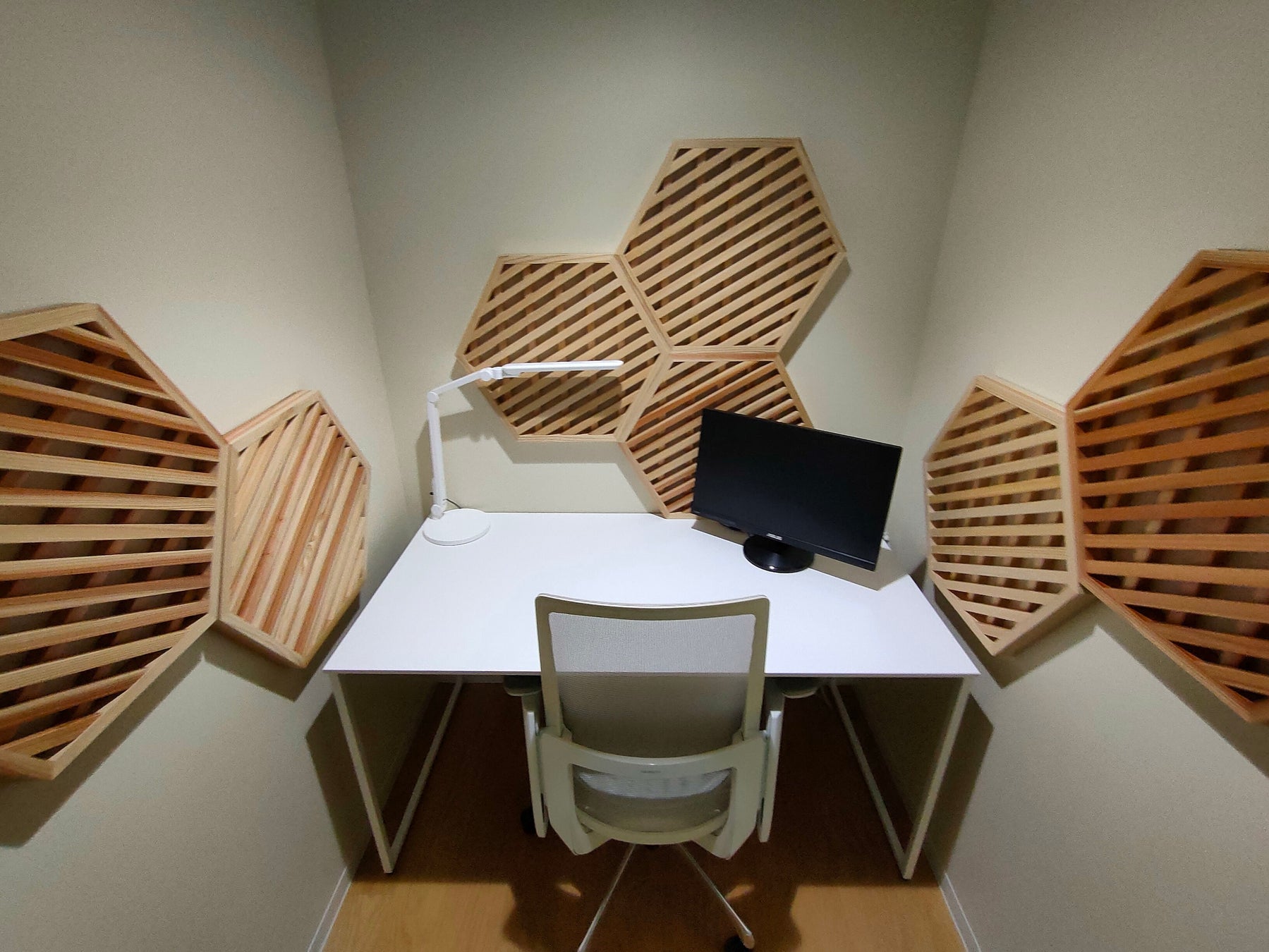 今回、試作品の「木製音響デザインパネル」による実証実験において、ウッドデザイン賞を受賞しました。実験内容としては、本パネルを設置した個室でWeb会議を想定した会話を行い、パネルの有無による、個室空間の「音環境」と「見た目の印象」の違いについてアンケートを実施。その結果、同パネルによって“音響調整機能と意匠性向上の効果が実感できる”との回答が得られました。