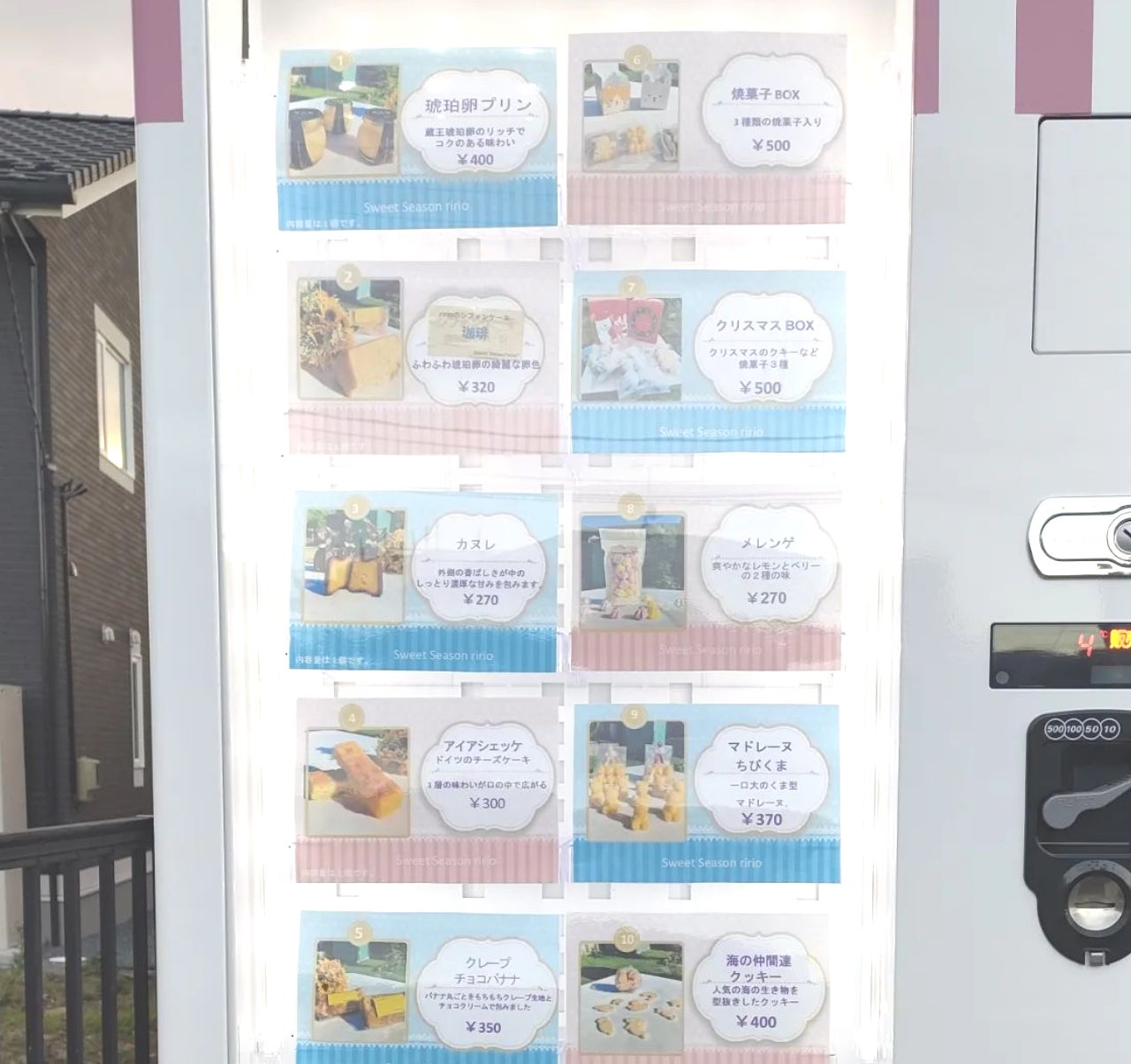 Sweet Season ririo様は、店舗営業が土日のみのため、平日や夜間にもお客様にスイーツを提供する新しい取り組みとして自動販売機を導入しました。自動販売機は通学路を通る方にも(バスを利用する方にも)購入しやすい場所に設置されています。