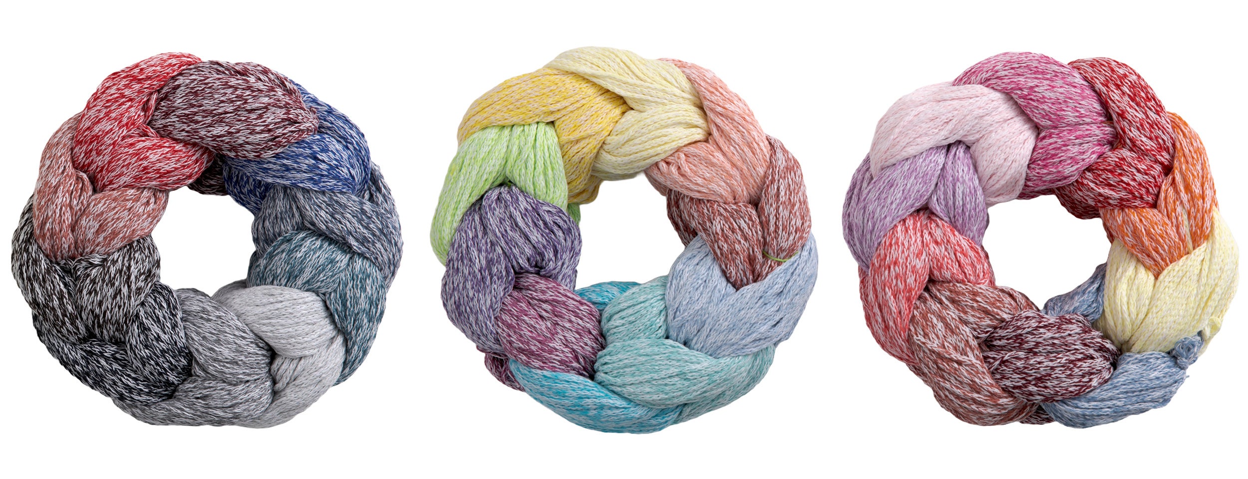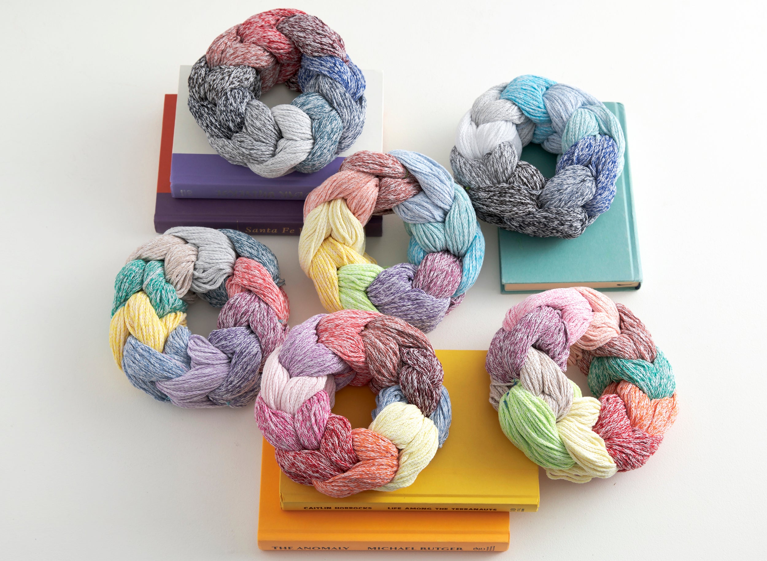 Tシャツを生産する時に出てしまう使用されずに廃棄されるコットンを集めてみじん切りにし、再度繊維に還元したリサイクルコットンを使用し、 リリヤン糸に仕上げた編みやすい極々太の手編み糸。10色の糸をつないで可愛いリース型に仕上げ、編み進めていくと自然に変わるボーダーを楽しめます。