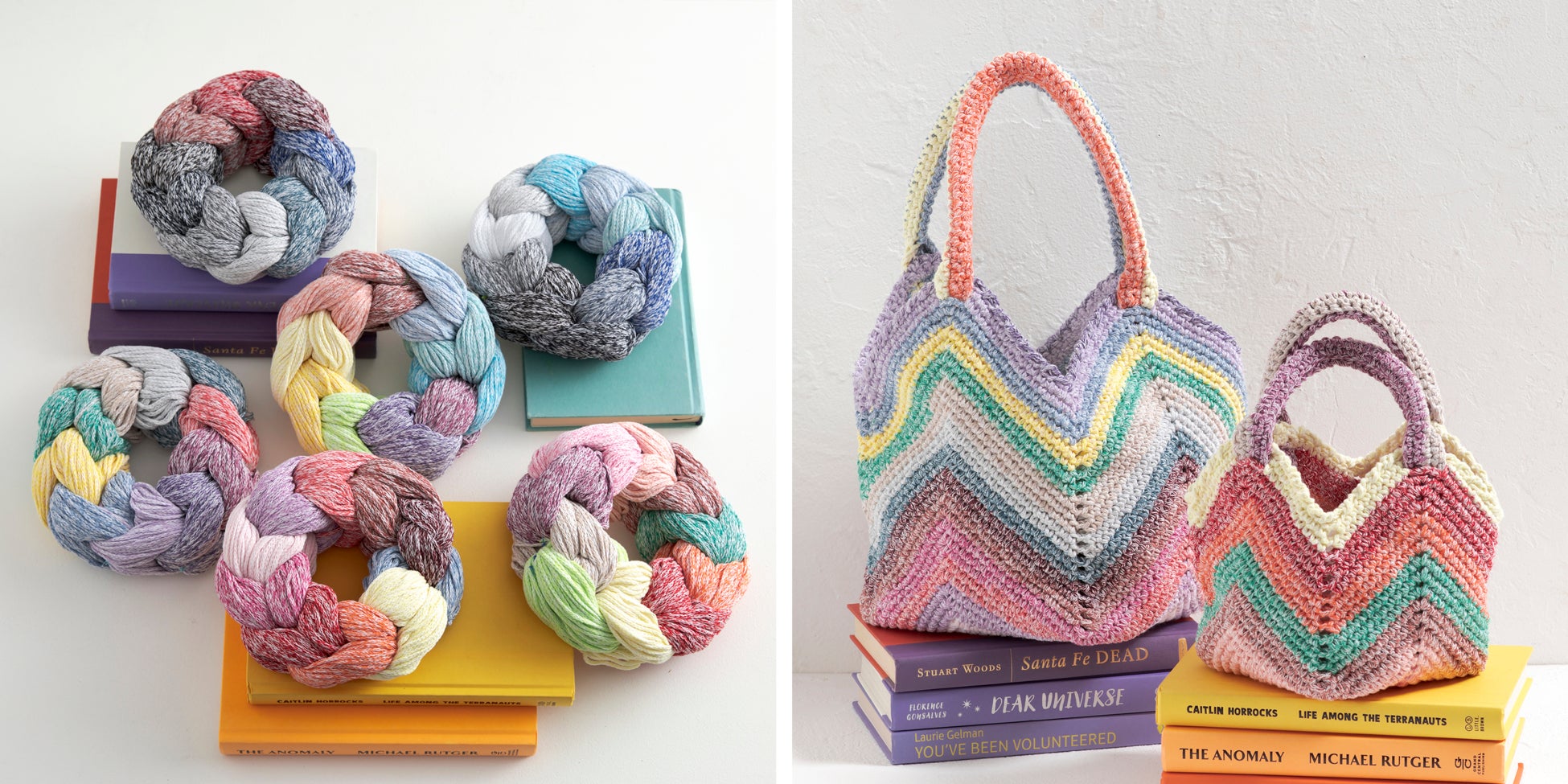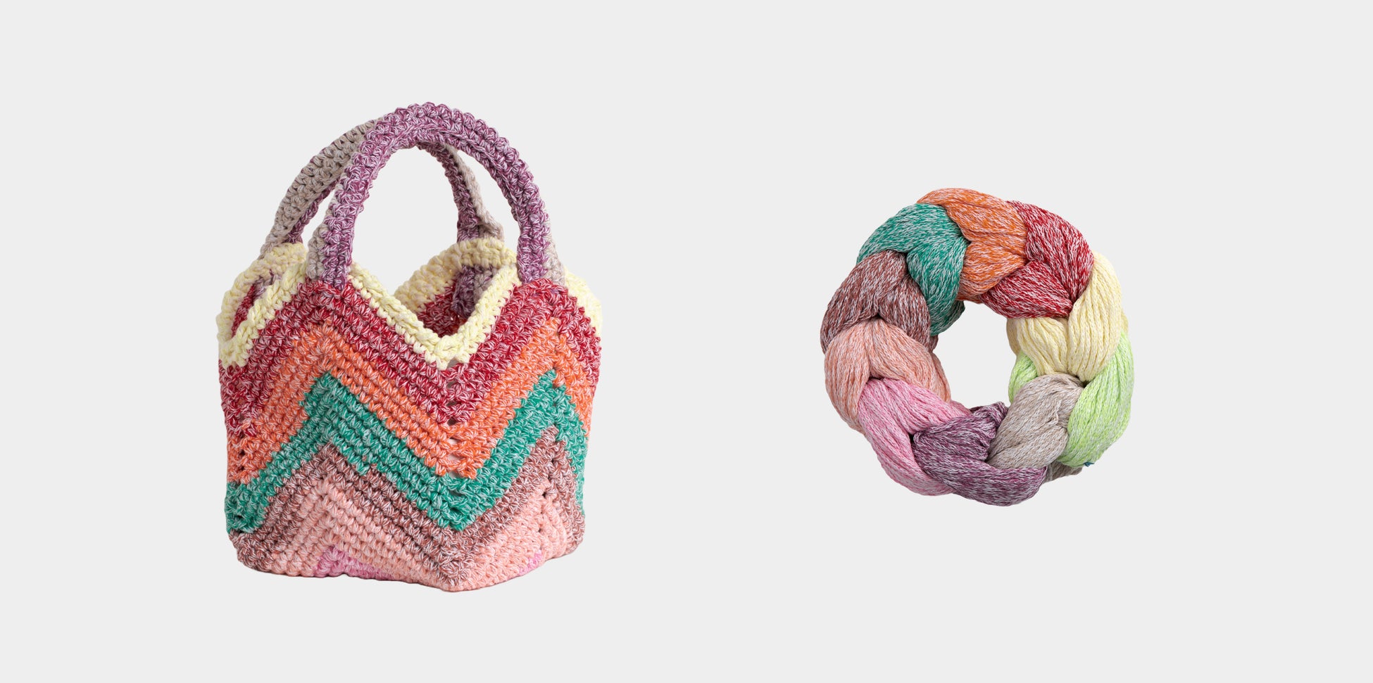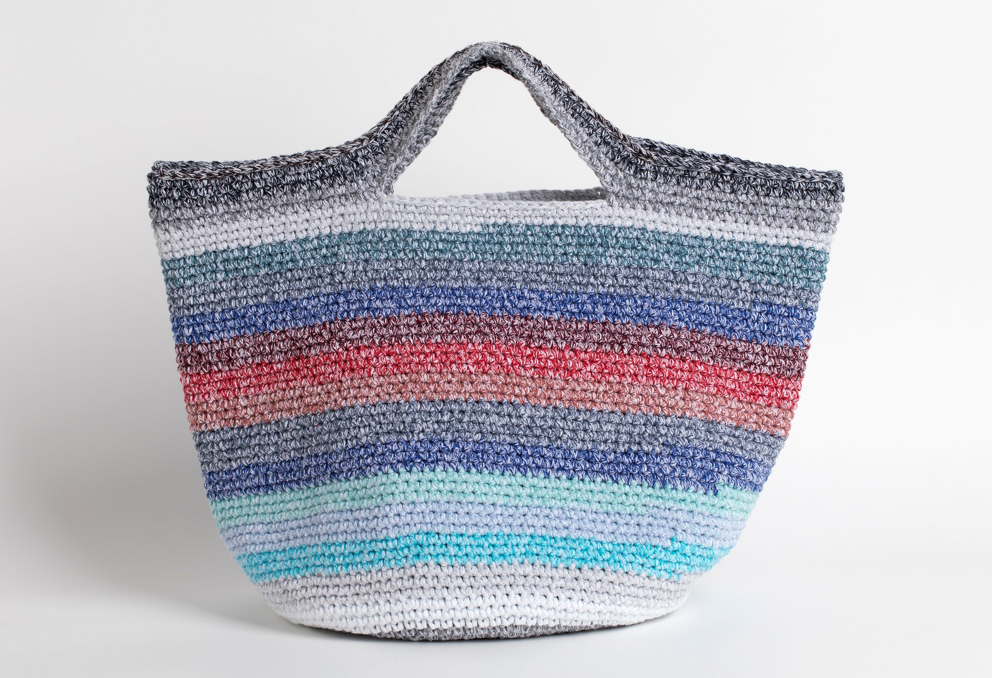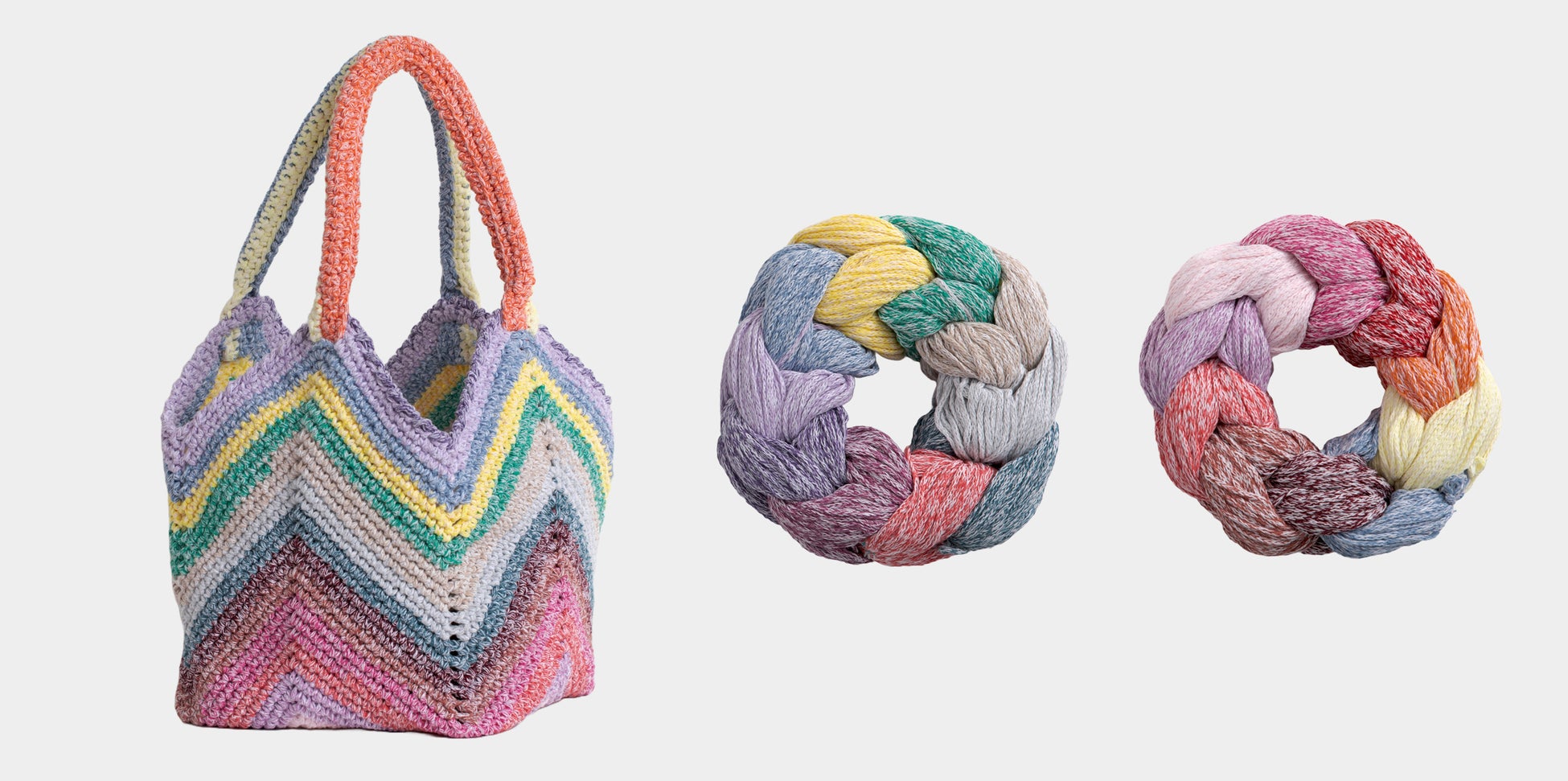 色ごとのかせをひとつずつ外しながら順番に編んだり、自分の好きな順番に並べ替えたりとアレンジしやすく、カギ針でしっかりと編むバッグやインテリア小物を編むことができます。