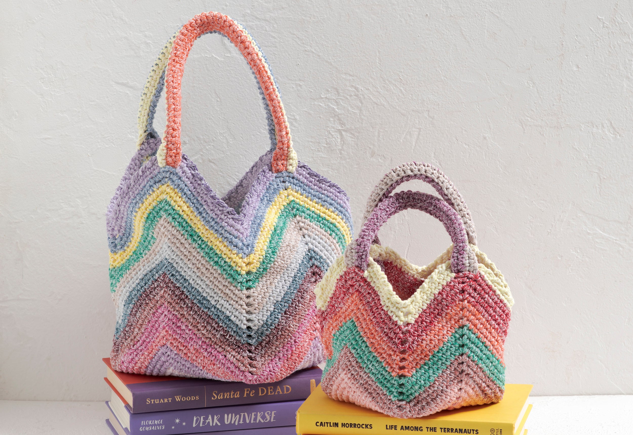 2つのツイストリースを組みあわせ、細編みだけで編み上げるグランバッグ。荷物がたくさんはいるのでメインバッグにおすすめです。