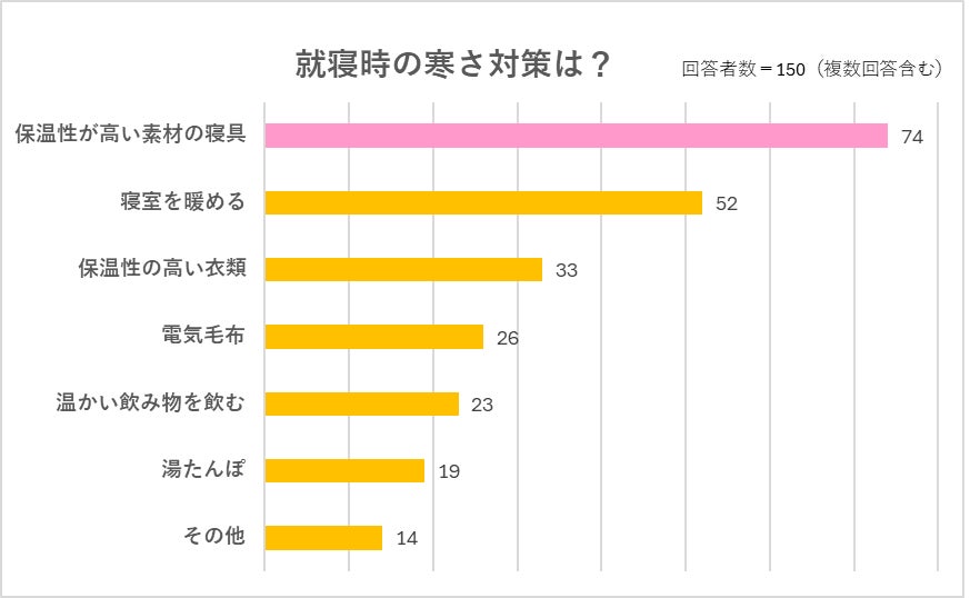 約5割が保温性の高い素材の寝具と回答、続いて寝室を暖めて寝るといった回答が多く、さまざまな寒さ対策をとっていることがわかりました。