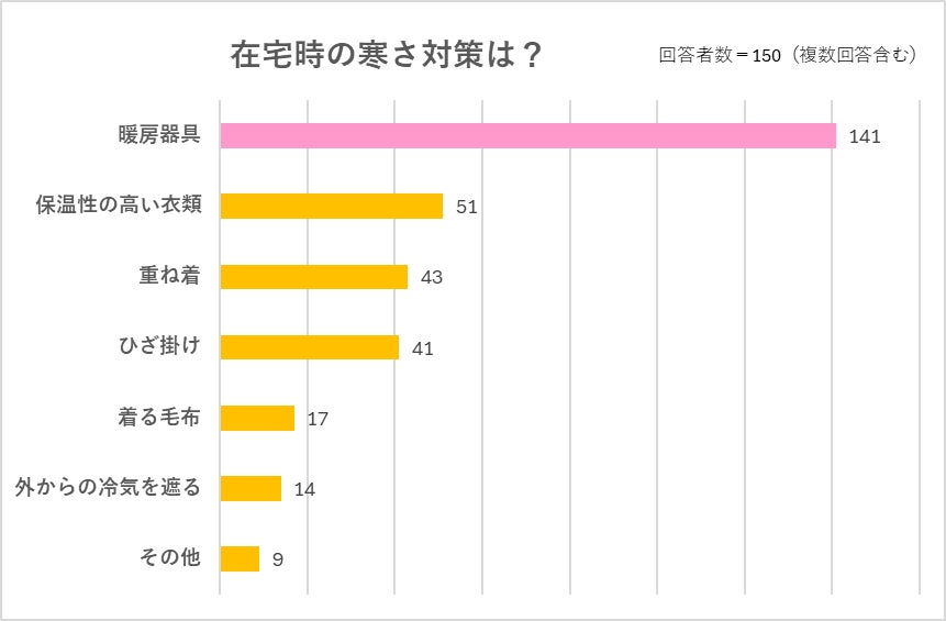在宅時での寒さ対策として、約9割が暖房器具と回答しました。その他、保温性の高い衣類や重ね着、ひざ掛け等を使用する回答も一定数ありました。