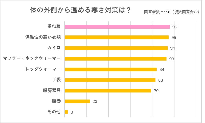 重ね着、保温性の高い衣類、カイロ、マフラー・ネックウォーマーに同等数の回答が集まりました。