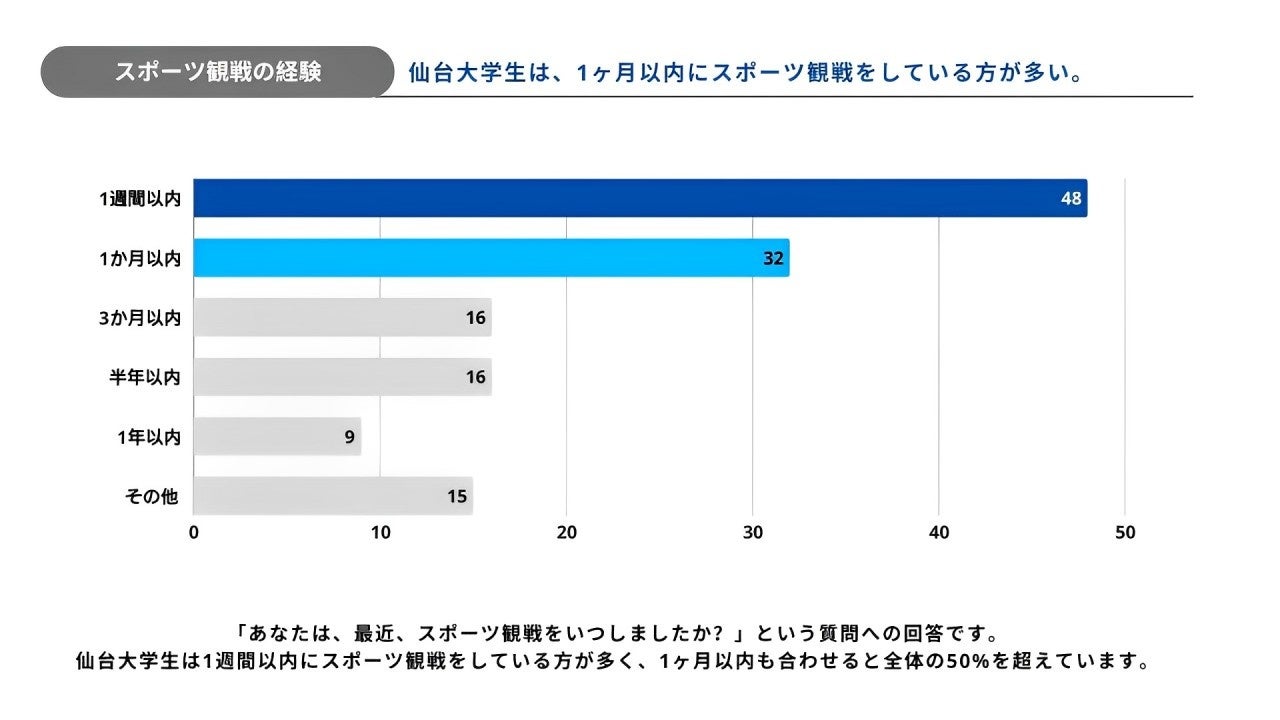 調査結果では、「最近スポーツ観戦をしましたか?」という質問に対し、「1週間以内」と回答した学生が48人を占め、さらに「1か月以内」の回答者を含めると全体の50人を超えました。比較的高頻度でスポーツ観戦を行っている傾向が高いことが明らかになりました。