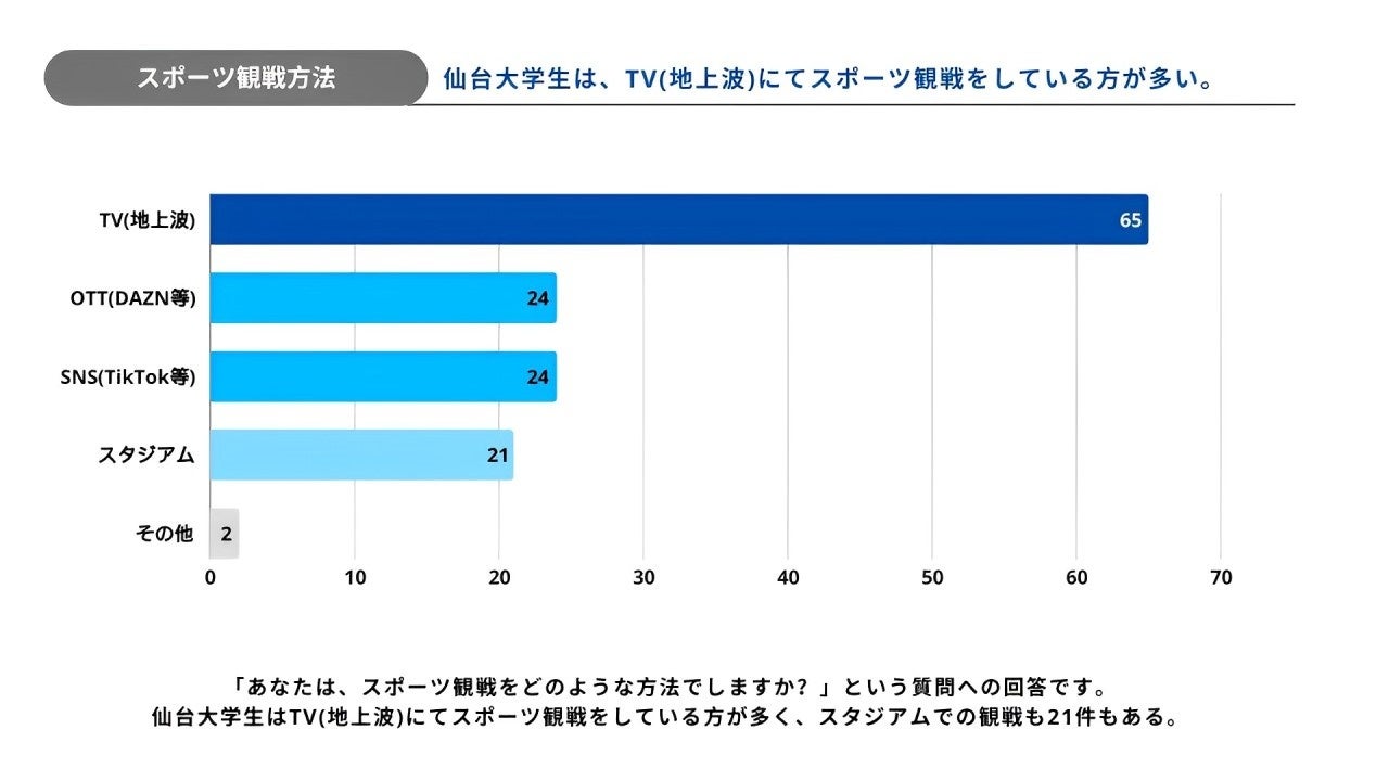 観戦方法については、TV(地上波)を利用する学生が65人と最も多く、OTTサービス(例:DAZN)やSNS(例:TikTok)で観戦する割合がそれぞれ24人と続きました。また、スタジアムでの観戦をする学生も21人いることが確認されました。これらの結果は、地上波放送が依然として主要な観戦媒体である一方で、若者層の中でデジタルプラットフォームやスタジアム観戦の需要も高まっていることを示唆しています。