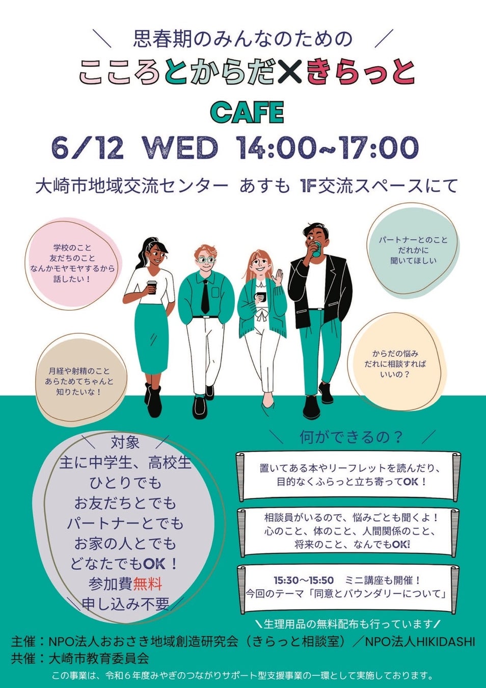 今回のユースカフェは、宮城県大崎市で悩みや不安を抱える女性や女の子のための相談窓口の事業を行っている「NPO法人おおさき地域創造研究所 きらっと相談室」様と共に、「こころとからだ×きらっとCAFE」という名称で開催することになりました。
