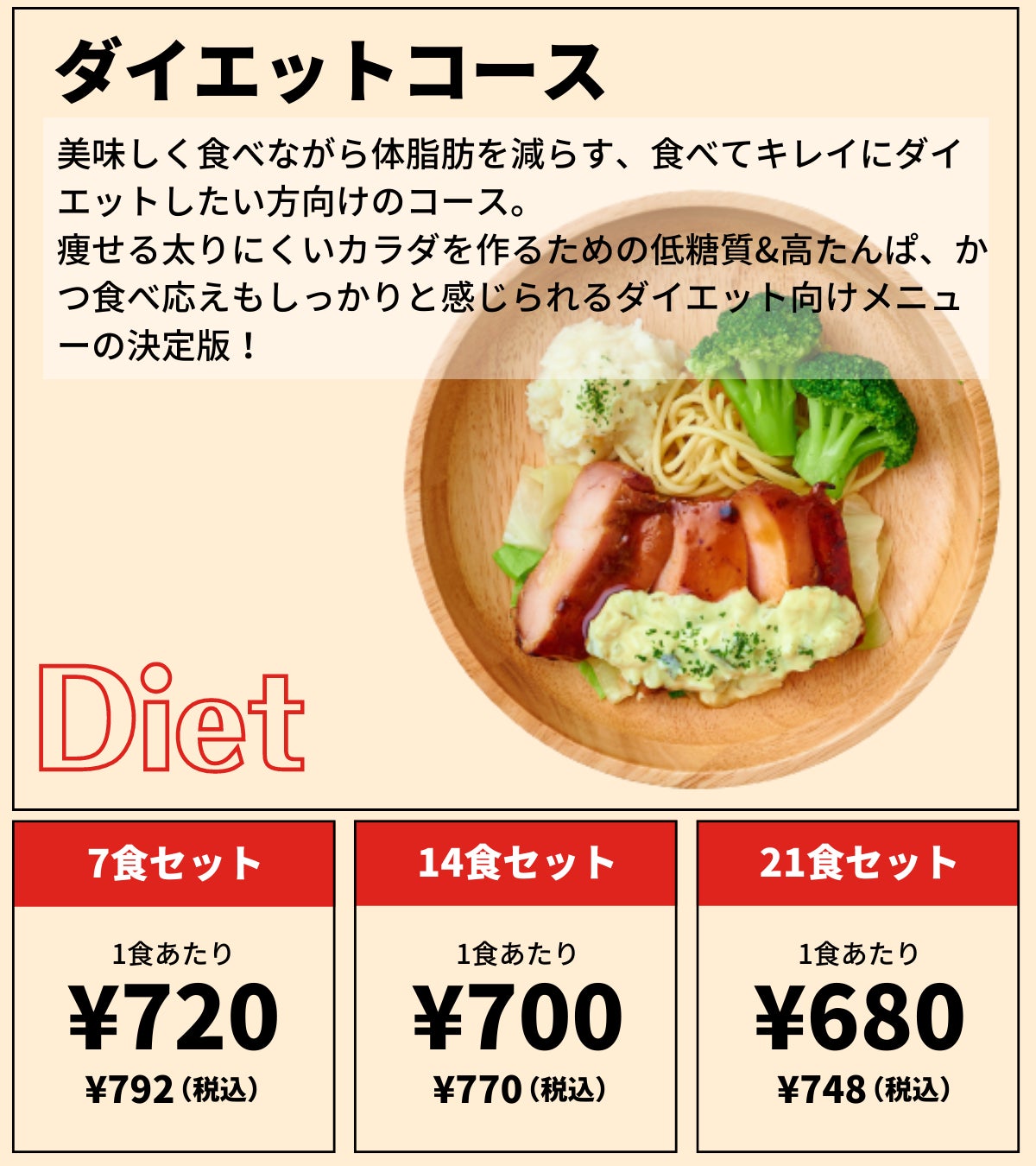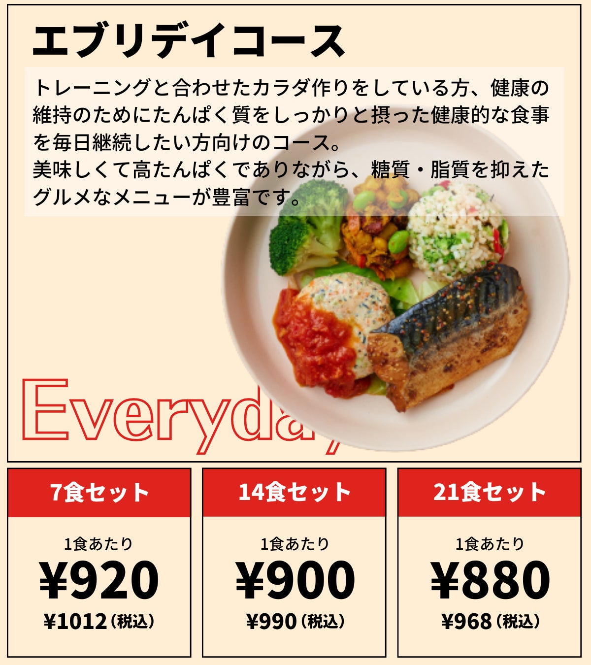 トレーニングと合わせたカラダづくりをしている方、健康礎のためにしっかりとたんぱく質が接種できる食事を毎日継続したい方向けのコースです。