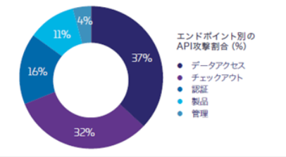 エンドポイント別の攻撃分布:データアクセス(37%)、チェックアウト・決済(32%)、認証(16%)、ギフトカード/プロモ認証(5%)、シャドウ・誤設定エンドポイント(3%)