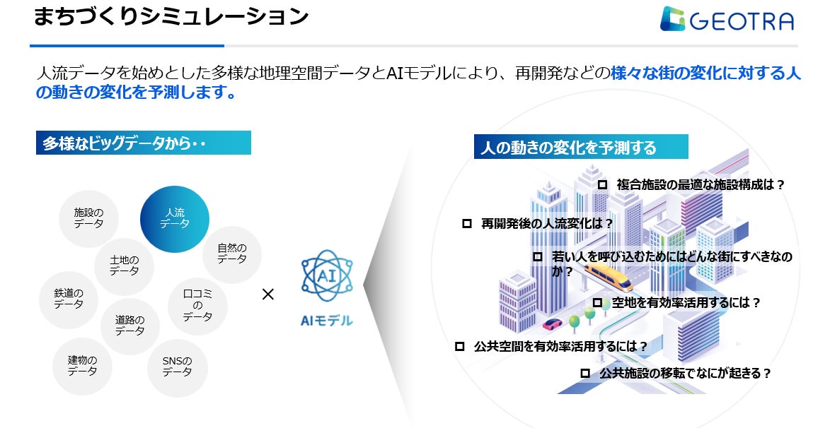 人流シミュレーションは、人流データと施設情報等の関連情報、機械学習モデルを掛け合わせて、まちの賑わいをモデル化し、再開発などの様々な街の変化に対する人の動きの変化を予測します。