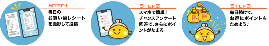 ①日常で発生したレシート5枚投稿で2ポイント(1円相当)進呈