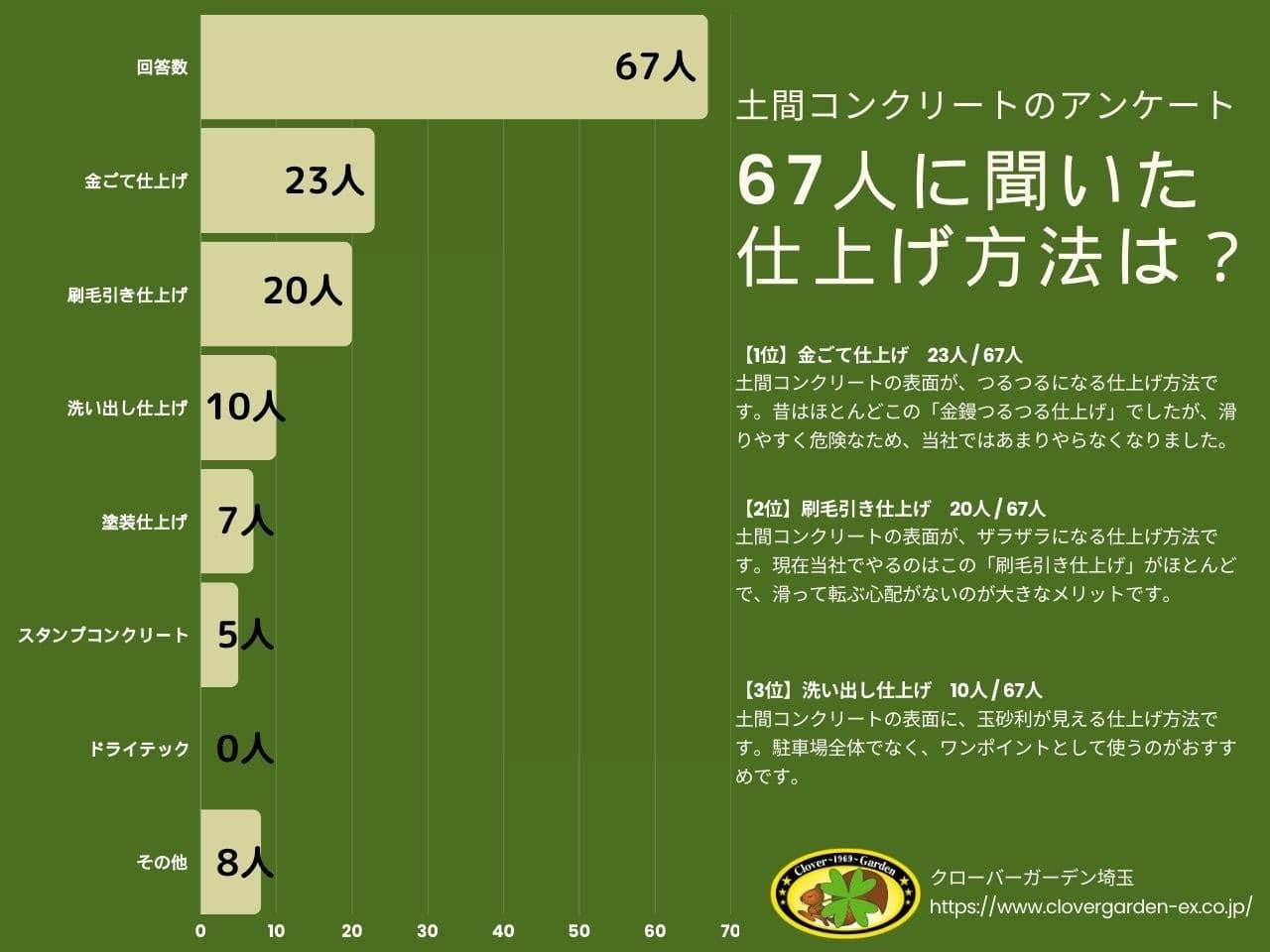 土間コンクリート工事の仕上げ方法に関する調査結果は、外構工事における仕上げ技術の好みと流行を反映しています。この調査は67人の経験者によって行われ、様々な仕上げ方法がどの程度の人気を博しているかを明らかにしています。