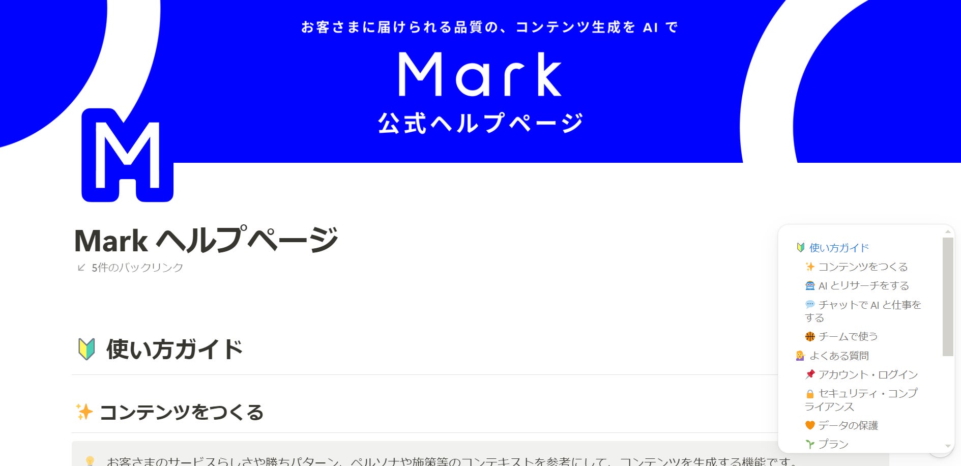 「Mark」サービス内の全ての機能を、オンライン完結ですぐにご利用頂けます。具体的な利用シーンを想定した各機能のマニュアル・機能別の使い方ガイド・FAQを参照出来るため、簡単に使い始めることが可能です。(Mark ヘルプページを確認する: https://help-mark.notion.site/)