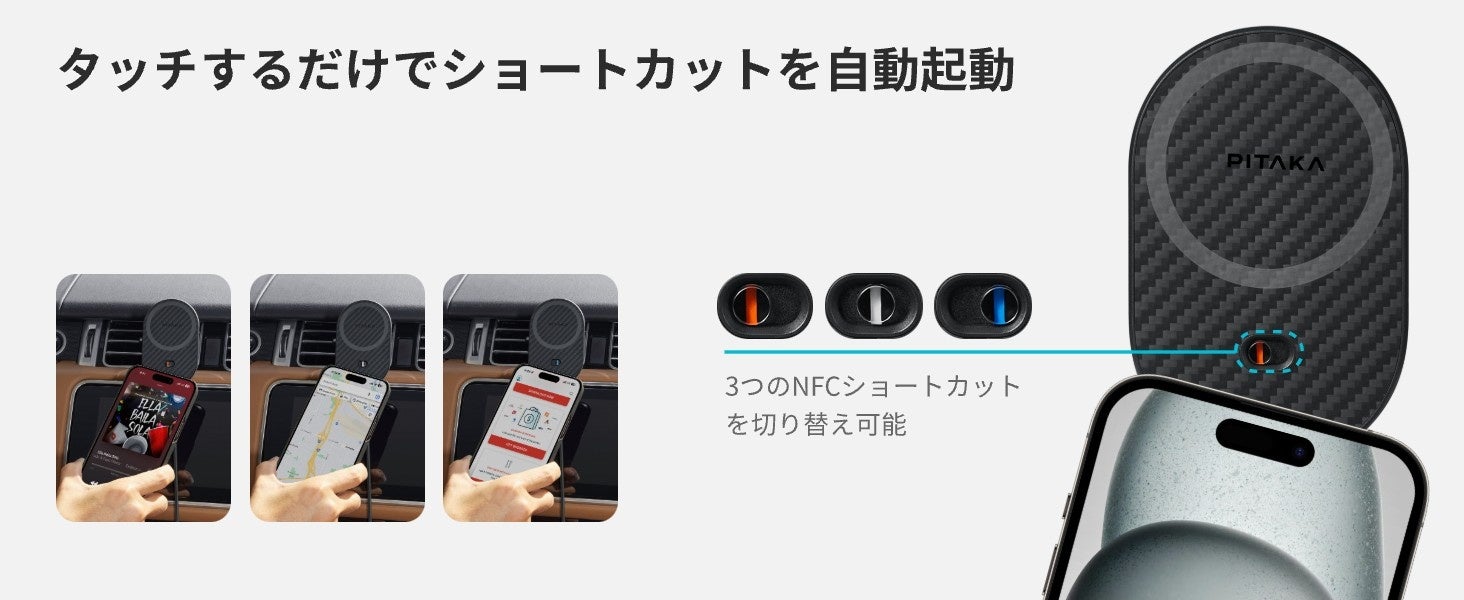 MagEZ Car Mount Pro 2内に3つのNFCタグを内蔵しています。そのため事前にiPhoneのショートカット機能を設定することで、iPhoneでタッチするだけで自動的に任意のアプリや機能を起動できます。