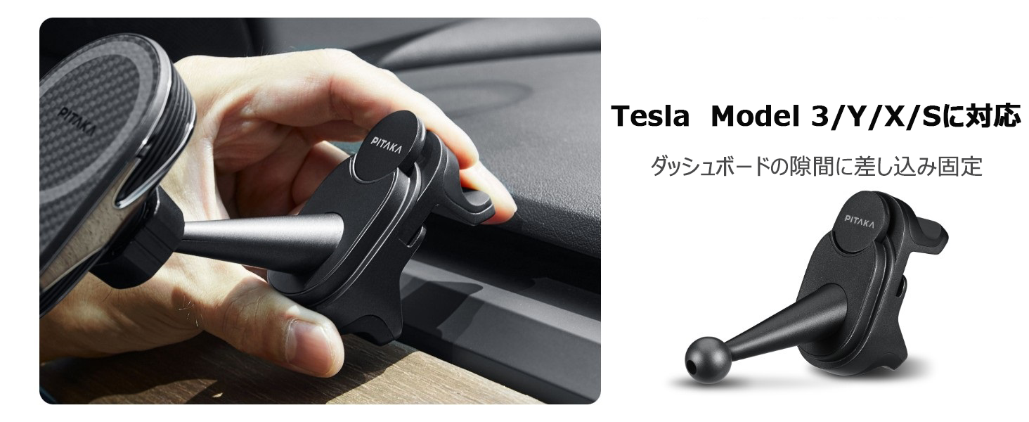 一般的なエアコン吹き出し口に対応する通常版モデルとは別に、テスラ用に特別に設計された取付アタッチメントバージョンも用意しています。テスラのダッシュボードにある隙間に本体をはめ込むことで固定されます。