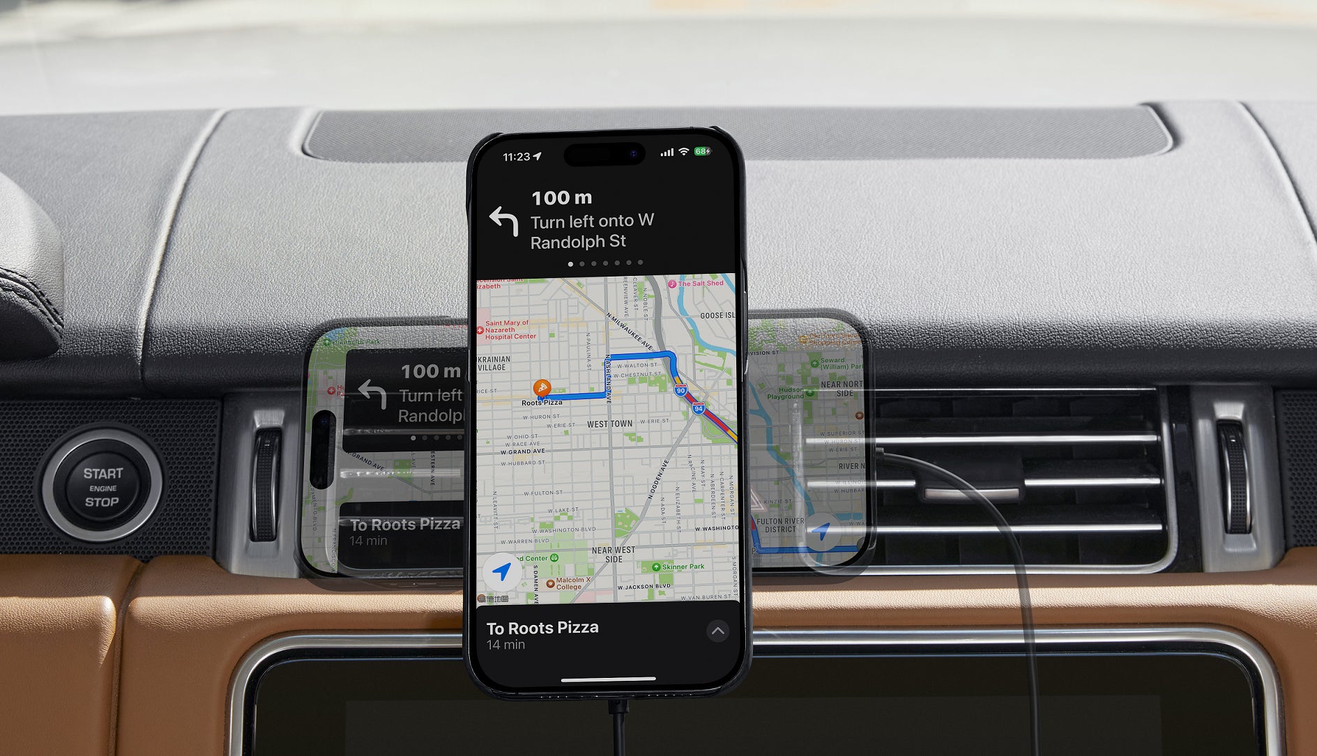 車載ホルダーにスマートフォンを取り付けることで自動的にワイヤレス充電が開始されます。15Wまでのスマートフォンを充電可能です。現行iPhone15シリーズの場合、最大7.5Wにも対応しています。