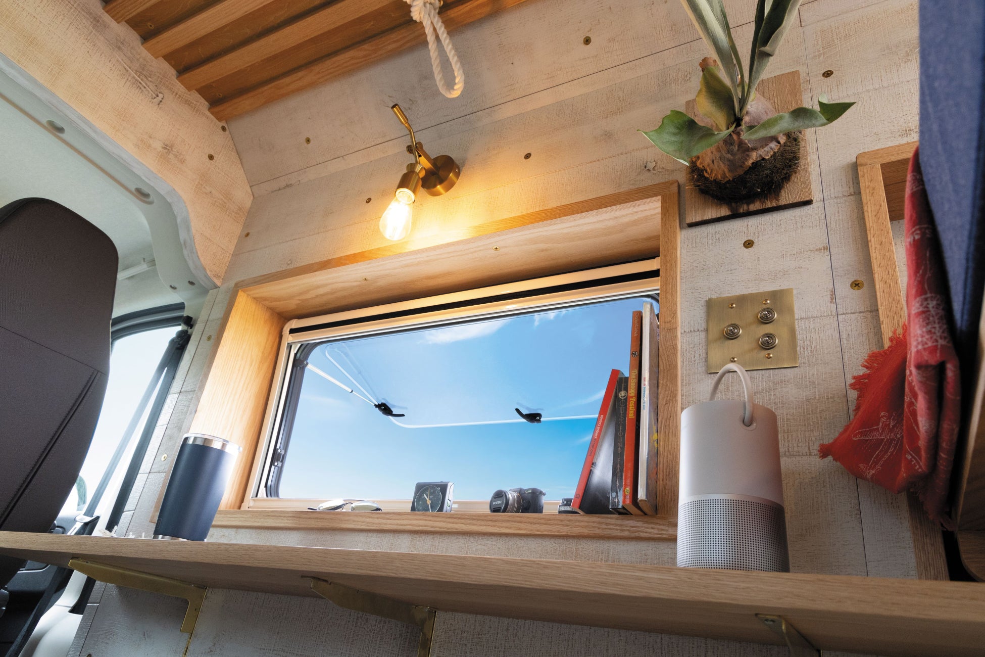 内装無垢材仕上げ(天井、床、壁、スライドドアパネル、リアゲートパネル)、アクリルウィンドウ(スライドドア側・木枠付)、タイヤハウスBOX、上部収納BOX、照明用レール(ソケット付)、ソケット2箇所