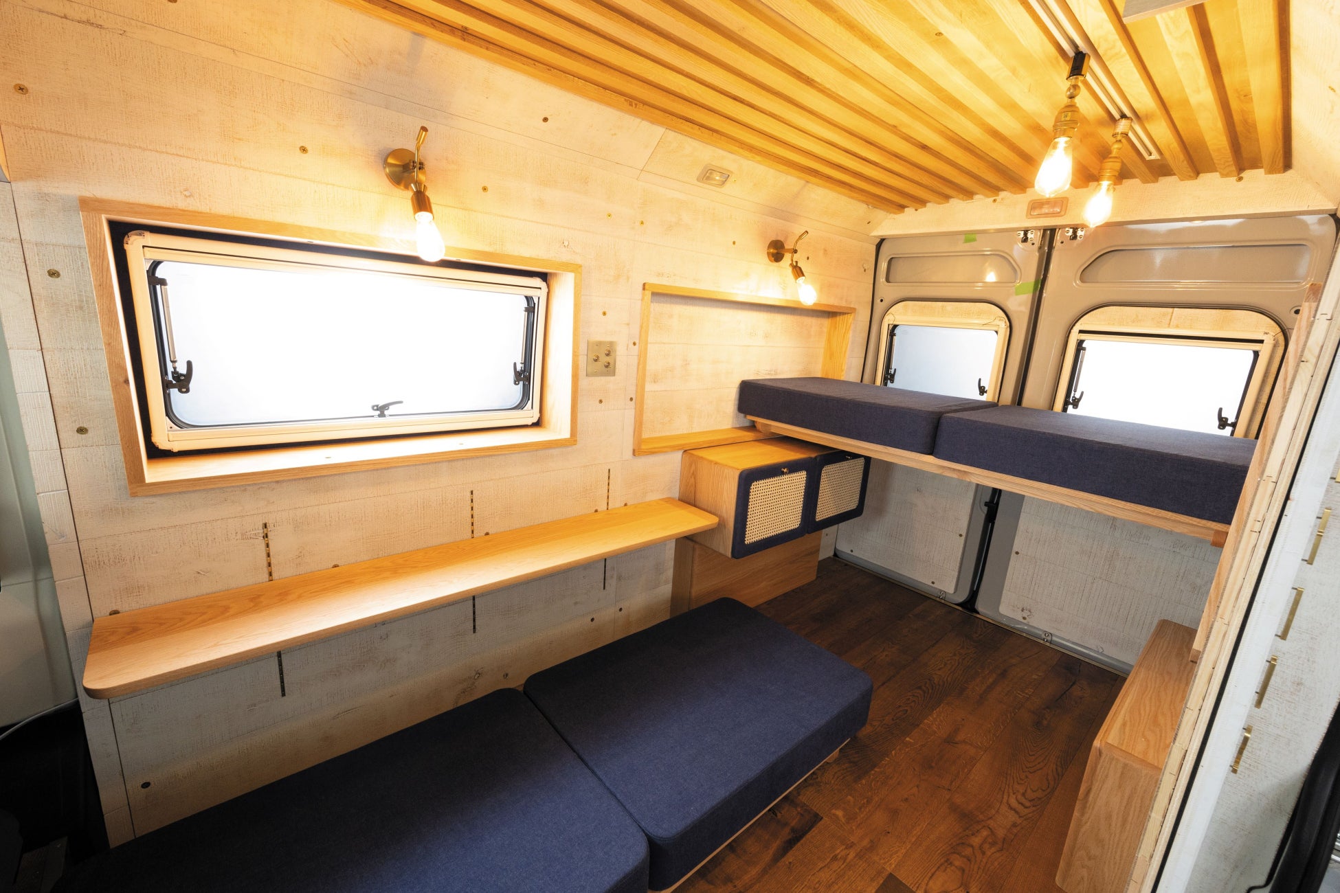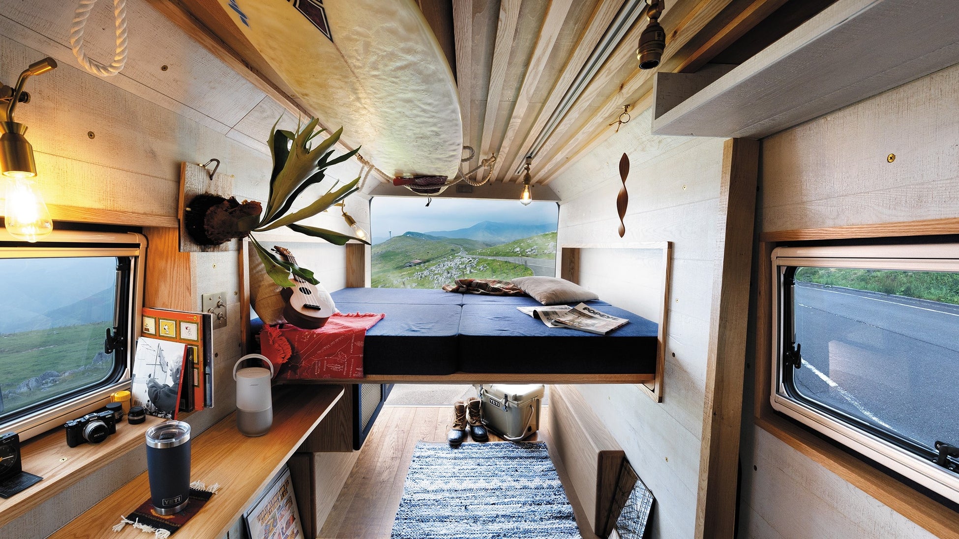 天井や床、壁の内装仕上げは、ワインの樽に使用されるほど水にも強い無垢材で知られる「オーク材」を使用。かつ、サーフィン、釣り、スノーボードなど様々な趣味・アクティビティでも気兼ねなく使用できるよう、バンドソー加工というヴィンテージ加工を促し、その上から床・壁それぞれのイメージに合う塗装を促したこだわりの設計。オーク材の原木をスライスした材料からそれぞれのパーツに使用しており、原木ごとの独自の木目や節の美しさが際立ち、一台一台が個性的で唯一無二の仕上がりとなります。