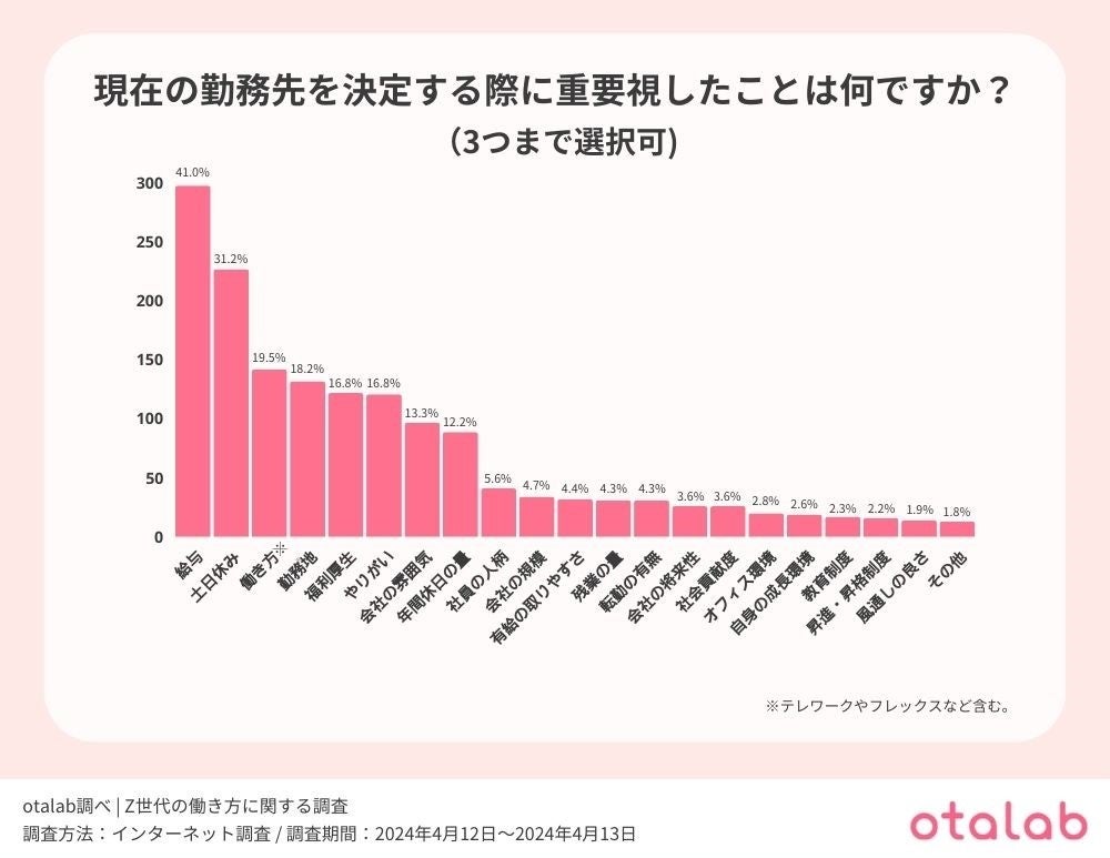 続いて、Z世代の人々がどういった部分を重要視して今の仕事に就いたかを知るべく、「現在の勤務先を決定する際に重要視したことは何ですか?」という質問を行った。