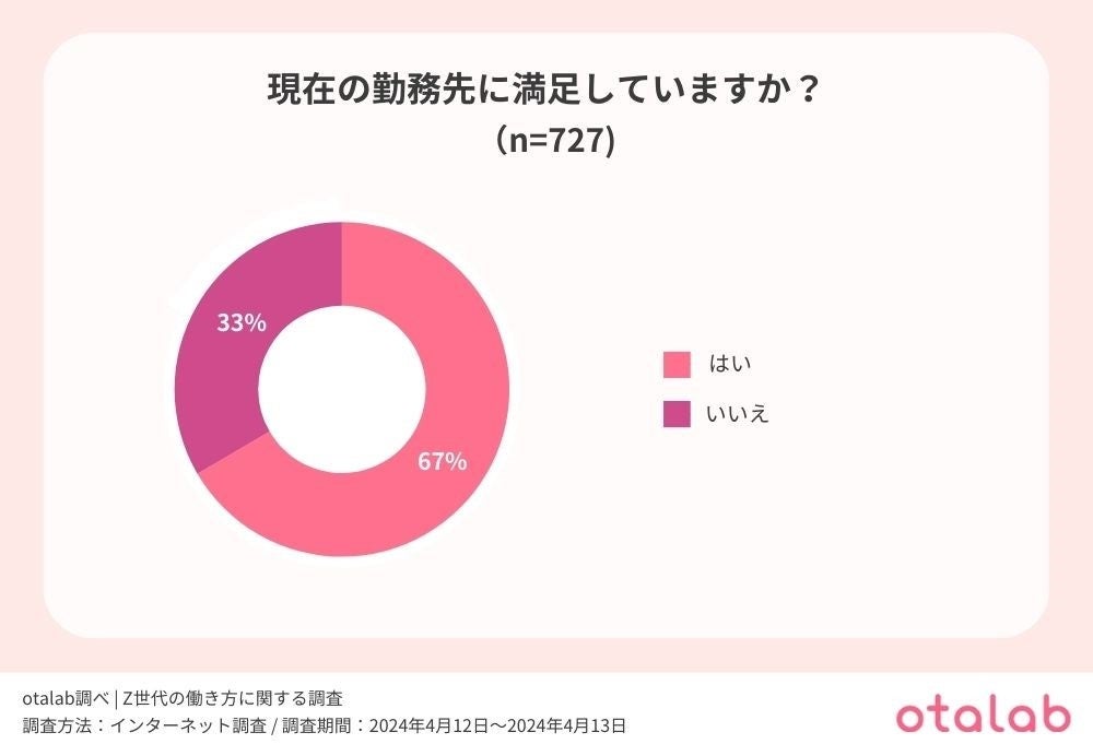 まず最初に、Z世代の人々の中で現在の勤務先に満足している人の割合がどれぐらいなのかを知るべく、質問を行った。