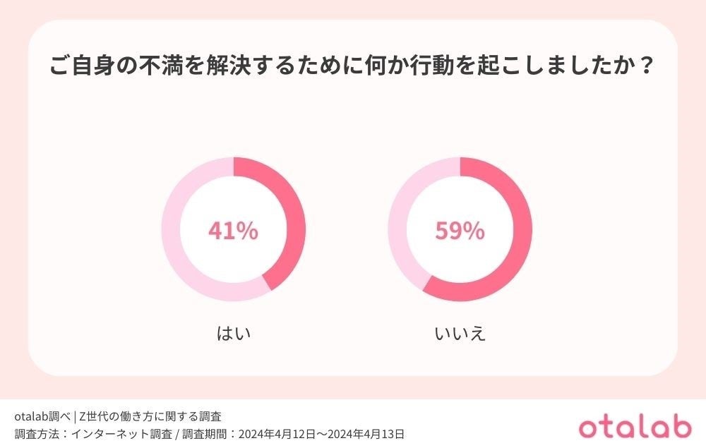 また、現在の勤務先に不満を持っている人を対象に「ご自身の不満を解決するために何か行動を起こしましたか?」という質問も行ったが、『はい』と答えた人は約4割であった。