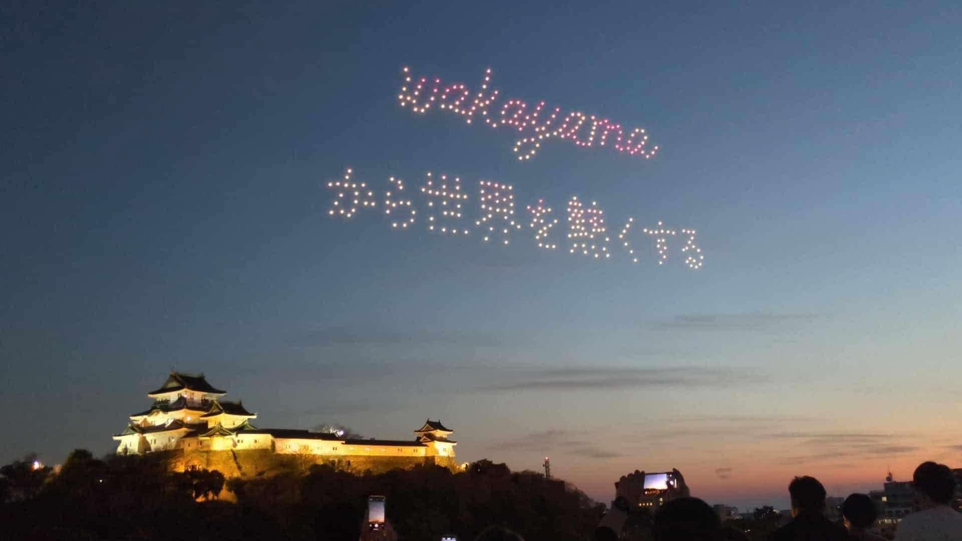 トークセッションに続いて、屋外でのドローンショーも開催されました。和歌山城を背景に300機のドローンが、夕焼けに染まる空の上に色鮮やかに「wakayamaから世界を熱くする」メッセージを描きました。