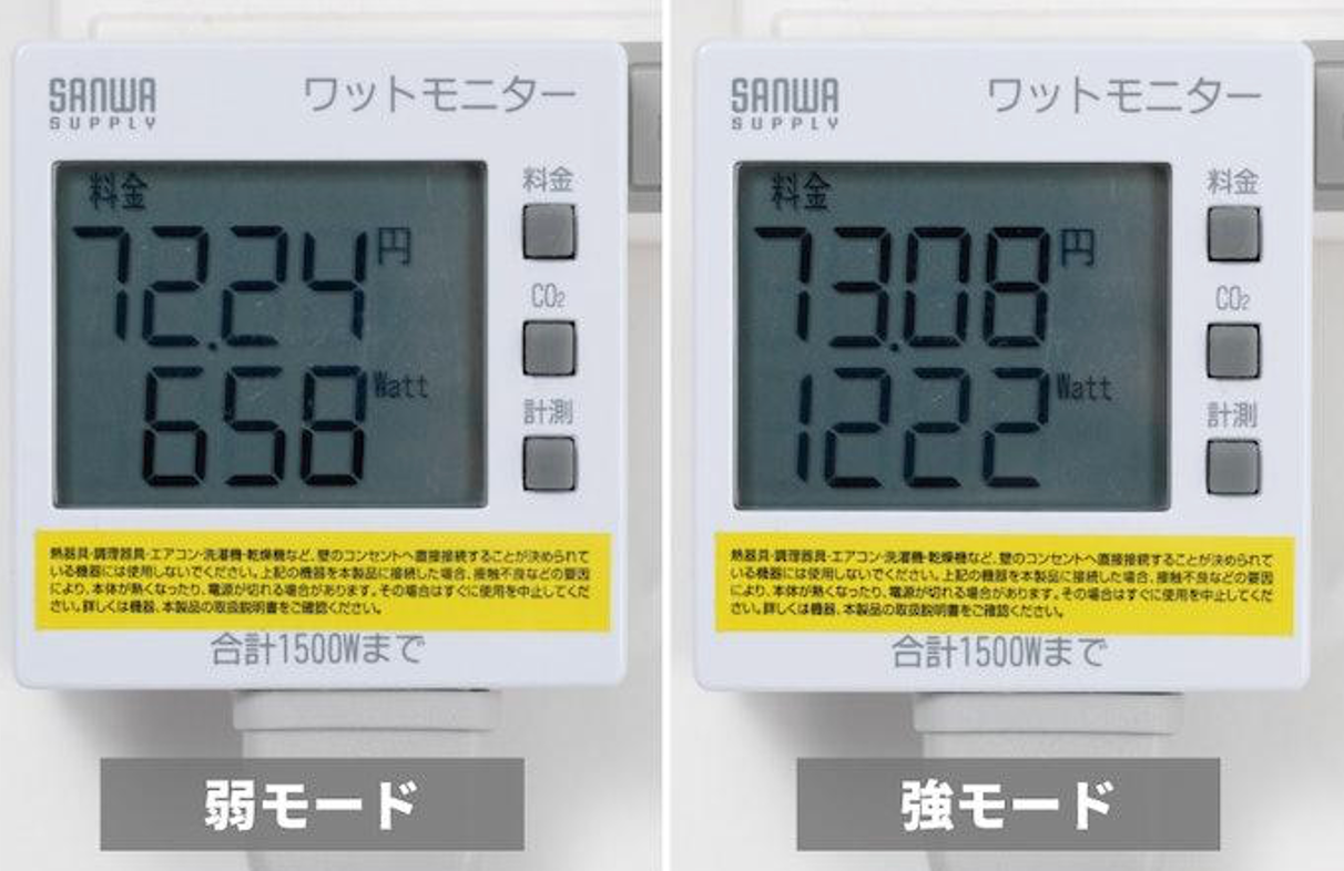 ワットモニターを使用して消費電力をチェックしたところ、弱モードでは658W、強モードでは1222Wでした。