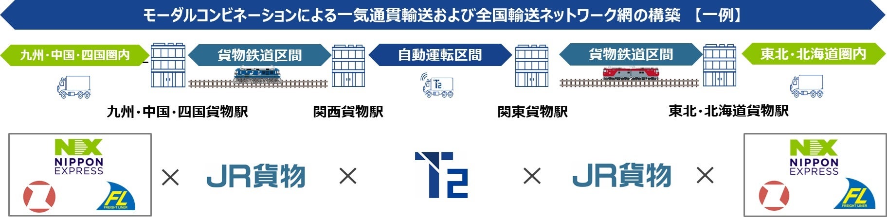 NIPPON EXPRESSホールディングス株式会社(代表取締役社長:堀切智)のグループ会社、日本通運株式会社(代表取締役社長:竹添進二郎、以下「日本通運」)、全国通運株式会社(代表取締役社長:永田 浩一、以下「全通」)、日本フレートライナー株式会社(代表取締役社長:峯 昭彦、以下「日本FL」)、日本貨物鉄道株式会社(代表取締役社長:犬飼 新、以下「JR貨物」)、株式会社 T2(代表取締役CEO:森本 成城、以下「T2」)の5社は、社会課題であるCO₂排出量削減、物流業界の労働環境改善および労働力不足への対策として、将来的なレベル4(*1)自動運転トラックと貨物鉄道を組み合わせて輸送する「自動運転トラック×貨物鉄道」モーダルコンビネーション(*2)の輸送モデルを構築するため、実証実験の検討を開始します。