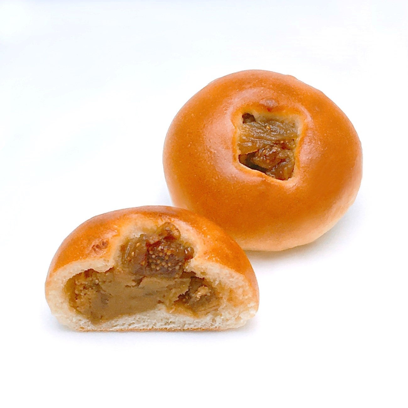 白こし餡とラム酒漬けのいちじく、きなこ、バター、黒蜜を合わせた餡を風味の良い酒種生地で包み、ラム酒漬けのいちじくをトッピングしました。※トルコ産の干しイチジク使用