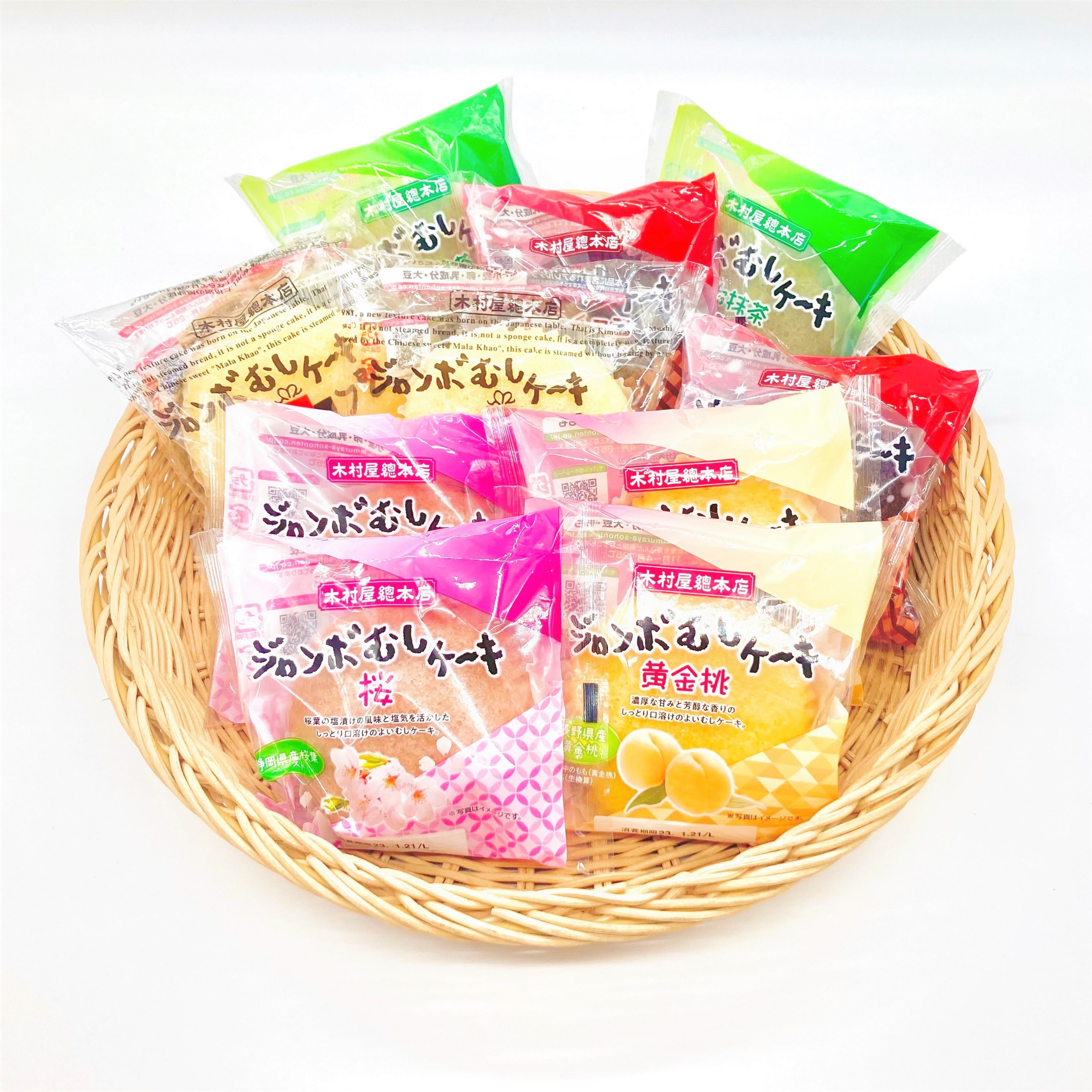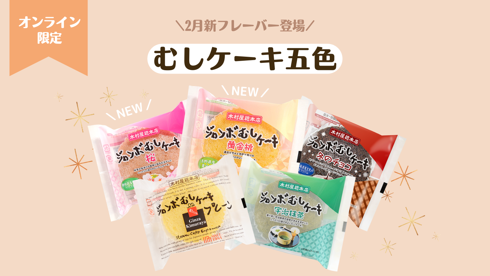 2月の「むしケーキ五色」は新商品のジャンボむしケーキ「桜」「黄金桃」が登場。「桜」には“静岡県伊豆産桜葉”を使用。日本人に馴染みのある桜スイーツの“桜もち”のような親しみやすい味わいに仕立てました。「黄金桃」は長野県産黄金桃の果汁使用。桃の濃厚な甘みを楽しめるむしケーキです。