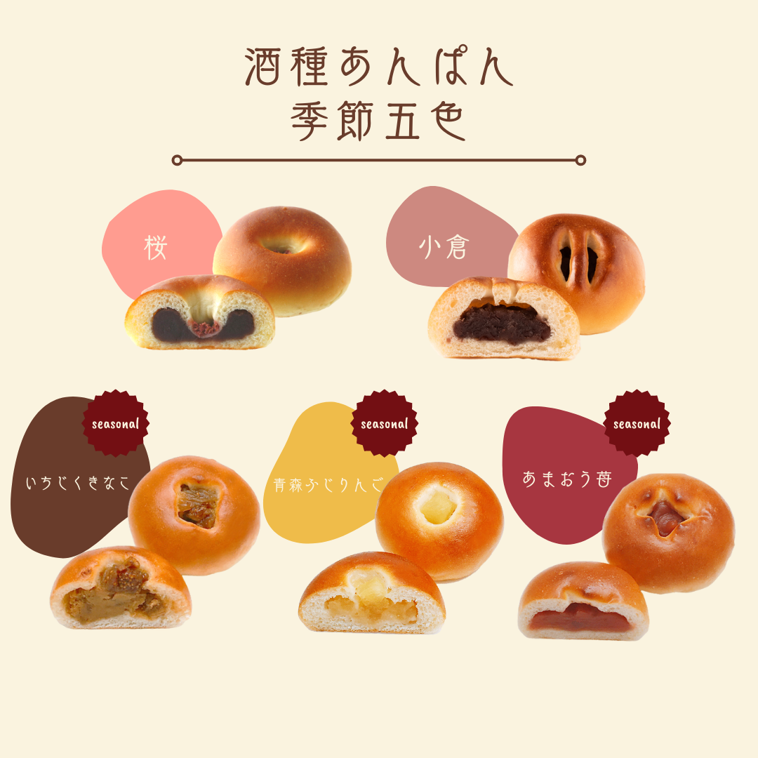 「酒種あんぱん季節五色」には季節のあんぱんの「青森ふじりんご」「あまおう苺」「いちじくきなこ」をご用意。お手土産にもおすすめです。