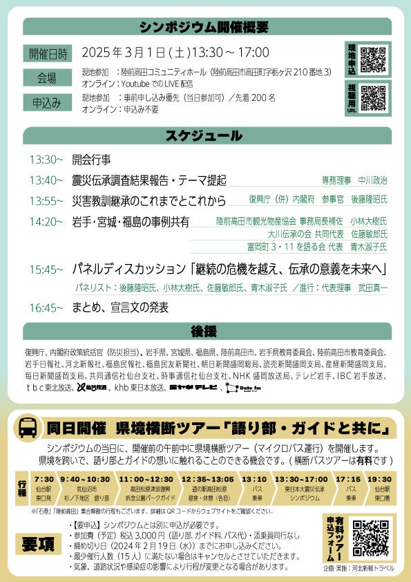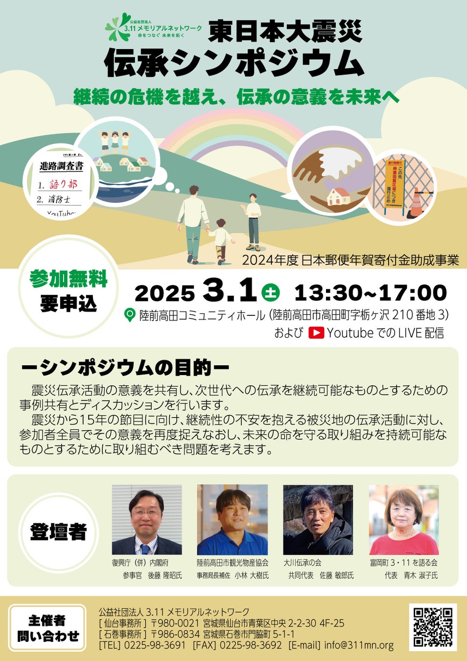 「3.11メモリアルネットワーク第7回伝承シンポジウムin陸前高田 継続の危機を越え、伝承の意義を未来へ」を2025年3月1日に開催します。伝承の可能性を議論します。また同日午前に、仙台からバスを運行し、宮城県気仙沼市杉ノ下地区の語り部と岩手県高田松原復興祈念公園パークガイドに参加するツアーへの申し込みも応募しています。
