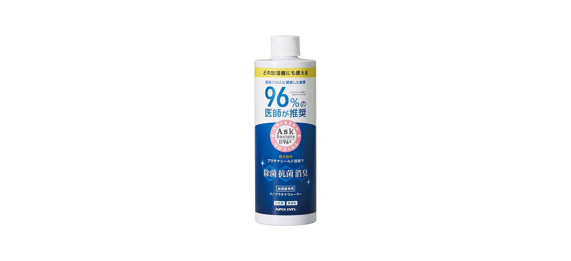 プラチナの力で加湿器やお部屋を除菌・抗菌・消臭する「加湿器専用ナノプラチナウォーター」のパッケージをリニューアル。医師推奨を示す「AskDoctors」を大きくあしらった新パッケージに刷新いたしました。