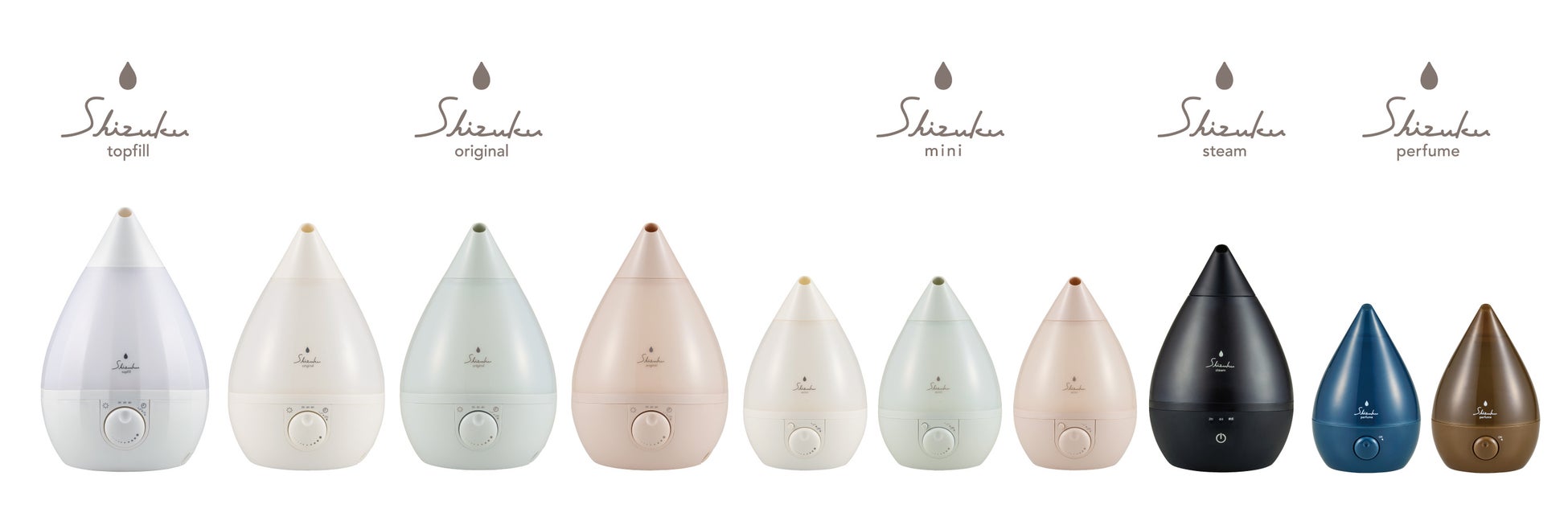 今シーズンは、シリーズ史上最大サイズ・最大加湿量を実現したシリーズ初の上部給水モデル「SHIZUKU topfill」を中心に、新たなカラーテーマ「Tea Collection」を採用した「SHIZUKU original」「SHIZUKU mini」、スチーム式「SHIZUKU steam」のリニューアル、アロマモデル「SHIZUKU perfume」など、多彩なラインアップをご用意いたしました。