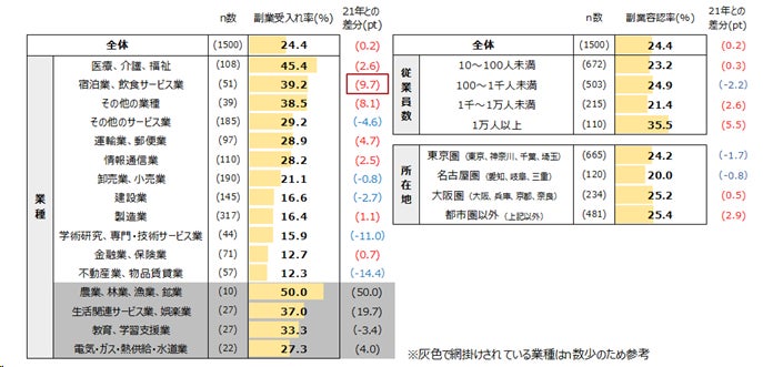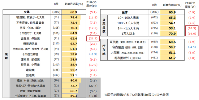 ① 副業容認率が最も高い業種は「宿泊業、飲食サービス業(78.4%)」で、21年調査から11.8pt上昇。前回からの上昇幅が最も大きい業種は「金融業、保険業」で、21.3ptの上昇。その他、従業員数1千人以上の企業における上昇幅も目立つ。