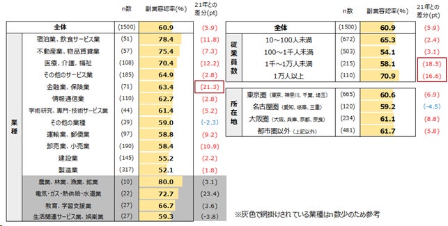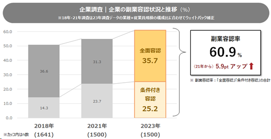 1. 企業の副業容認率は60.9%で、21年調査より5.9pt上昇。副業解禁の動きが拡大。