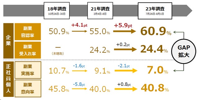 企業の副業容認率は上昇トレンドである一方で、正社員の副業実施率は微減トレンド