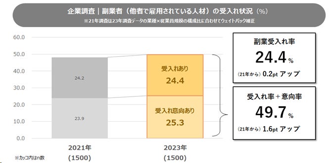 2. 企業の副業受入れ率は24.4%で、21年調査から変動なし。副業容認率とのギャップが目立つ。