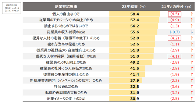 ② 副業容認理由として、「個人の自由なので(58.4%)」が最も高く、21年調査から4.5pt上昇。全般的にスコアが上昇しており、特に「従業員のモチベーション向上」「優秀な人材の確保・定着」などの理由が、前回から上昇している。