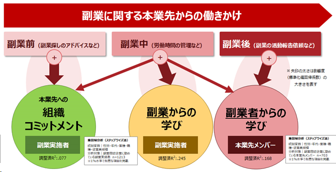 本業先企業の副業者への働きかけは、副業者や周囲のメンバーへの学びを促すだけでなく、本業先への組織コミットメント、継続就業意向、上昇意向の高まりにも寄与する。本データが、副業者への積極的関与について、本業先企業が検討する上での判断材料になれば幸いである。
