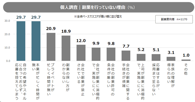 ① 副業を行っていない理由として、「自分の希望やスキルに合っておらず、副業求人への応募を控えてしまう(29.7%)」と「本業が忙しく時間が無い(29.7%)」が最も高い。