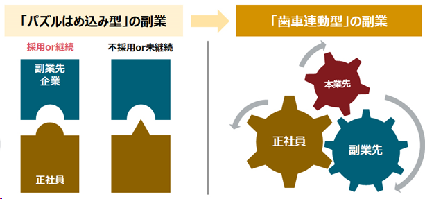 従来の副業について、1回の面談だけで認識合わせを行うケースが多く、副業者へのオンボーディングに力を入れていないことなどから、「パズルはめ込み型」の様相が確認された。企業と個人の双方にとって実りある副業を実現するためには、副業先の企業と個人の二者に加えて、本業先の企業も巻き込んだ、三者による「歯車連動型」の形態が重要である。