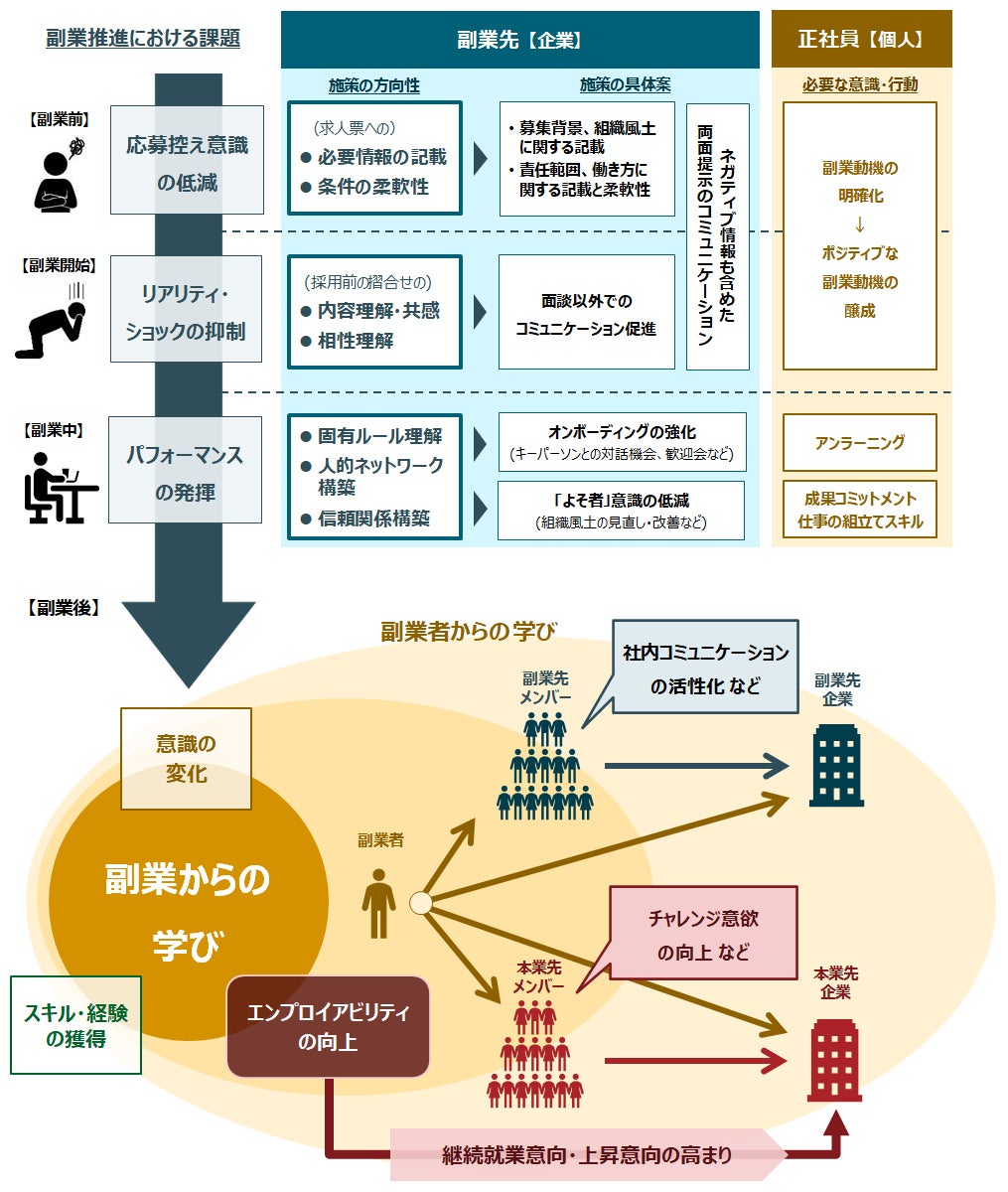 6. 副業前~副業開始~副業中の課題(「求人への応募を控える意識の低減」「リアリティ・ショックの抑制」「パフォーマンスの発揮」)を解決するポイントは、個人に求められる意識・行動と、副業先企業における「求人募集」「採用」「オンボーディング」観点の総合的な施策の実施。