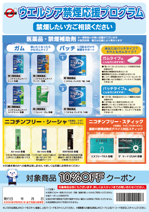 ●店頭にて禁煙のご相談をいただいたお客様へ医薬品・禁煙補助商品、その他禁煙関連商品に対する割引クーポンの提供