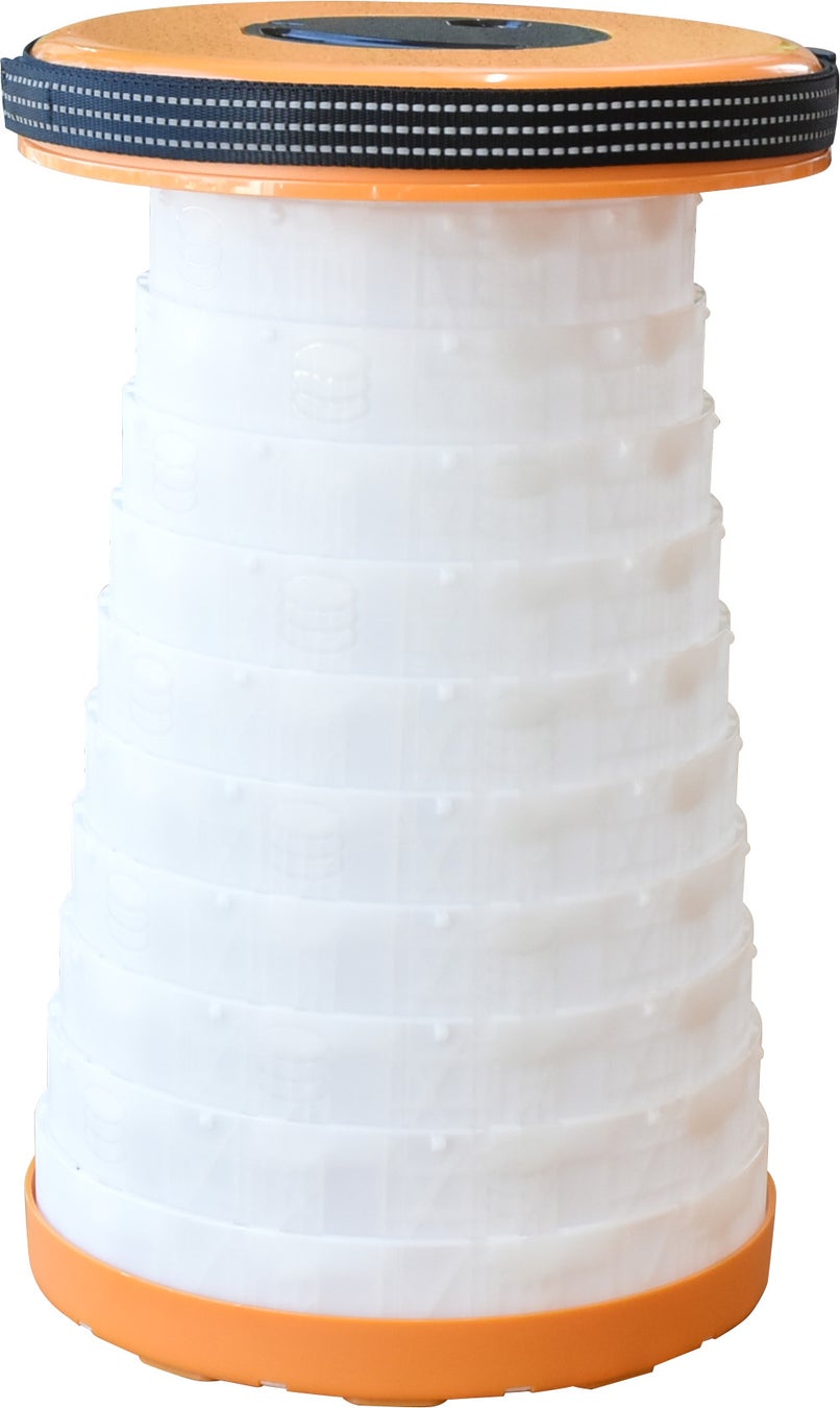 サイズは直径262×高さ収納時65、最大展開時420mm。重さ1280g。耐荷重180kg。ロックできる溝が11か所あり、好き位置で固定が可能。大人でも子供でもシチュエーションに合わせて高さを変えて座ることができます。本体内部にLEDを搭載。天面部のボタンを押すとLEDが点灯。イス全体が明るくなり暗い場所でもランタンとしてお使いいただけます。ボタンを押すごとにグラデーションモード、点滅モードに切り替えてお使いいただけます。電源は単三電池2本使用。肩から掛けられるベルト付きで簡単に持ち運びができます。ちょっと座る場所が欲しい。作業するのにイスが欲しい。屋外のイベントやキャンプなどでイスを持っていきたい。そんな方におすすめの「ランタンのようなアコーディオンツリーチェア」です。