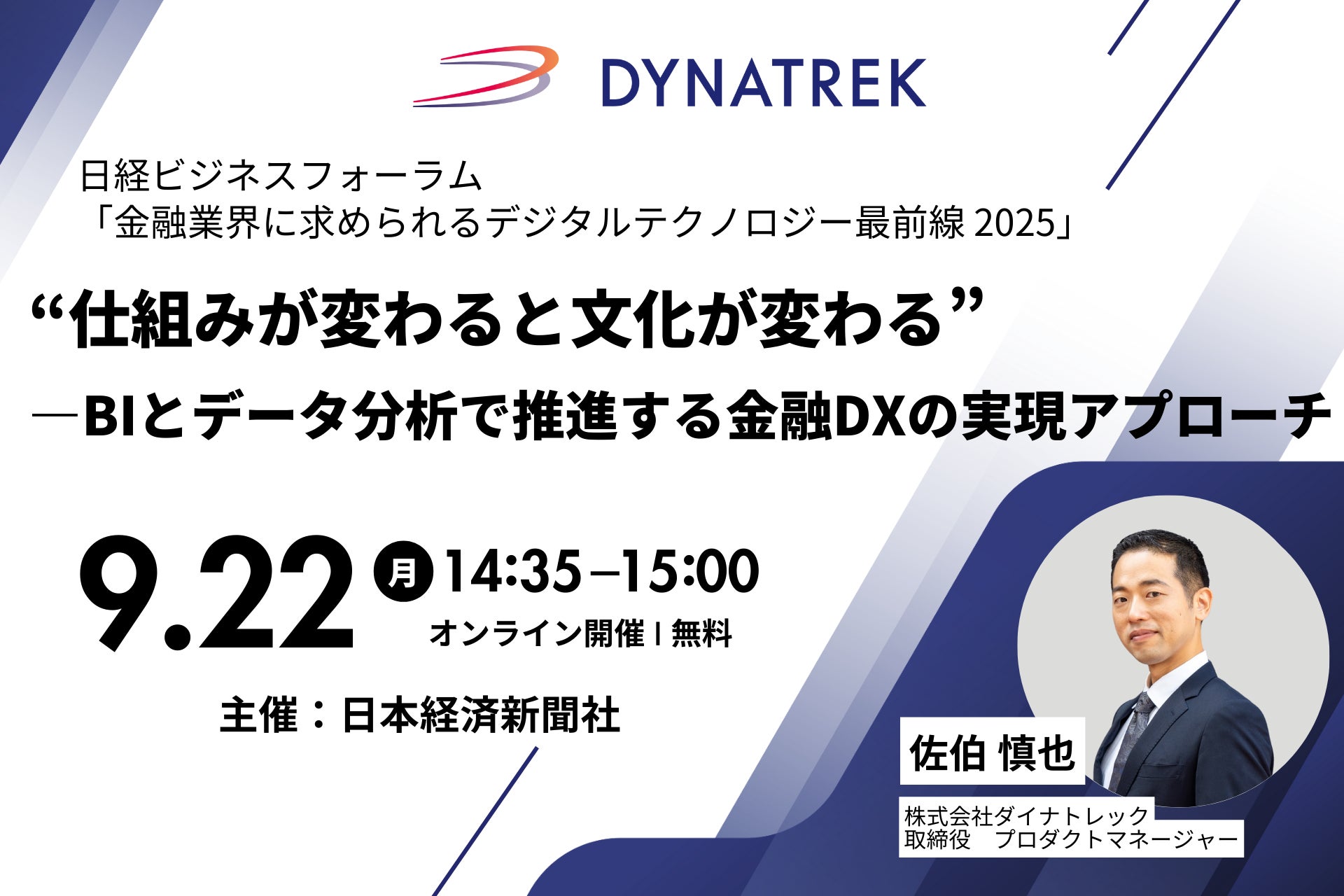 本セミナーでは、「“仕組みが変わると文化が変わる”―BIとデータ分析で推進する金融DXの実現アプローチ」と題したセッションで、当社取締役 佐伯慎也がサービスの紹介を行います。