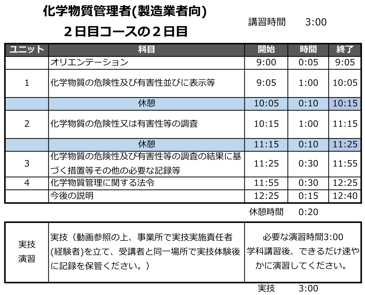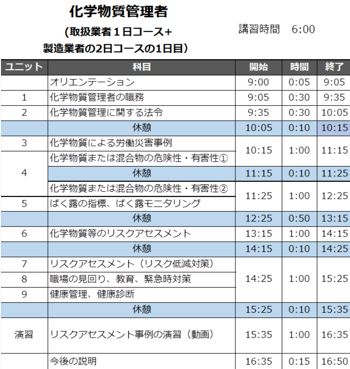 令和6年4月以降に化学物質管理者として選任される予定の方を対象に、必要な知識と実務能力を習得していただくため、学科9時間のカリキュラムによる講習です。